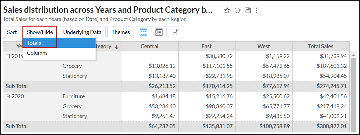 By default, Analytics Plus displays the subtotals and grand total of all the rows and columns. However, you can choose to change the position of these totals or turn them off and hide specific columns in the pivot table.