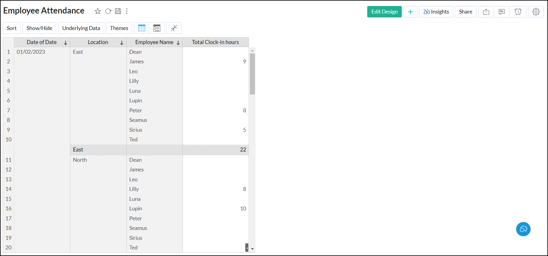 The generated pivot table displays all the employee attendance irrespective of the missing Clock-in hours and Location to which the employee belongs.