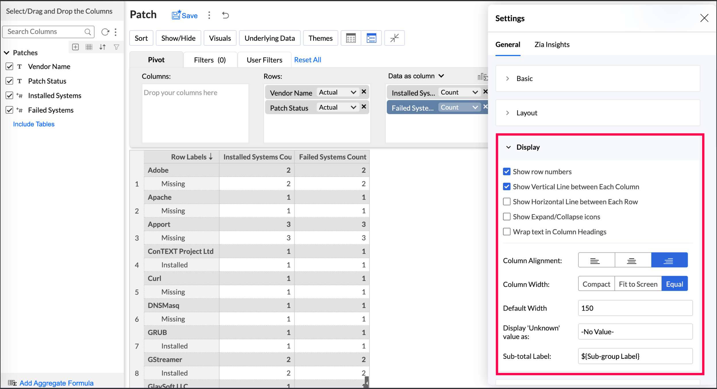 Analytics Plus enables you to change the display label and format of the data columns used in the pivot table. To do this, follow the steps below: