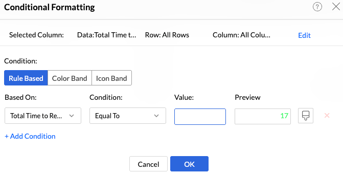 Click Add Condition to include more conditions. Specified conditions will be evaluated, and the corresponding formatting options will be applied to the data that meets the condition.