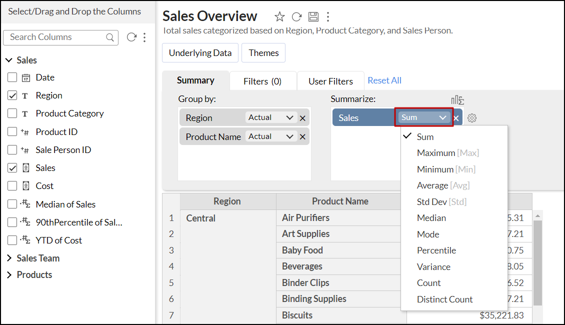 Drag and drop the Product and Region columns to the Group By shelf and the Sales column to the Summarize shelf. Click the Click Here to Generate Summary button to create the summary view.