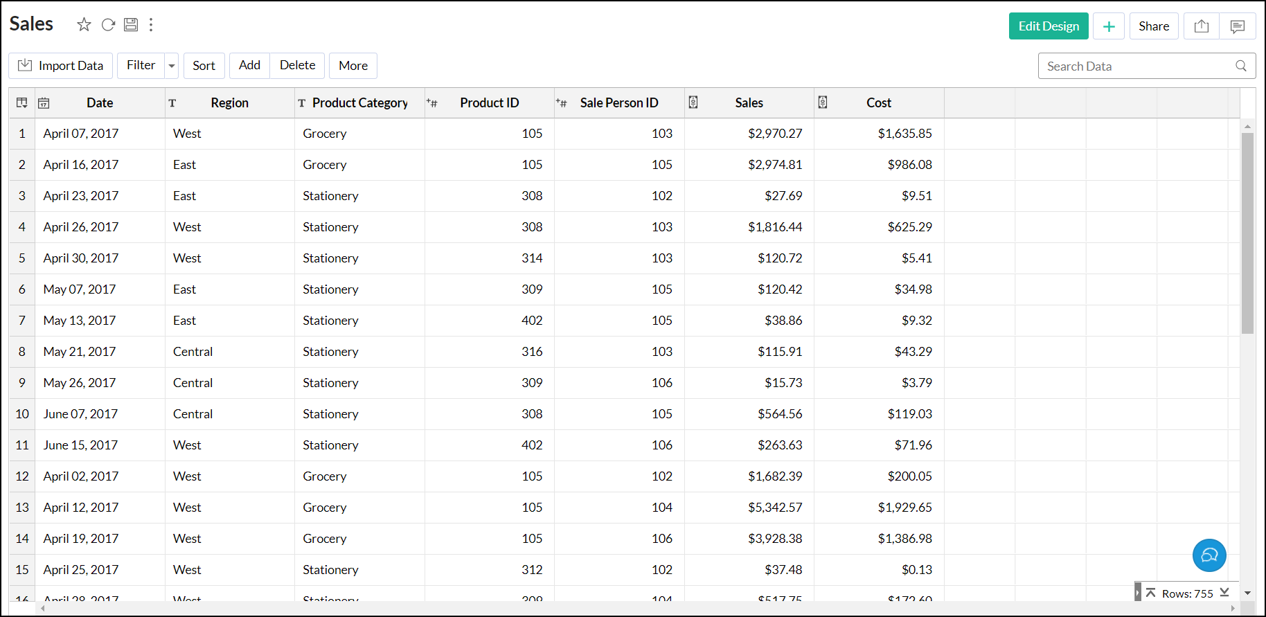 • In the Edit Design window that opens, drag and drop the required columns from the left pane to the corresponding shelves in the design area.