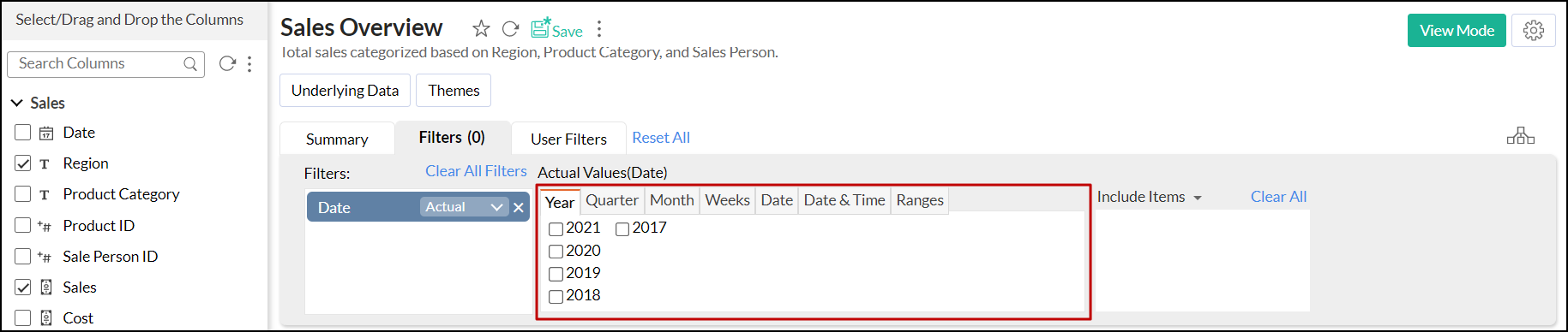 Analytics Plus allows you to filter columns based on individual values, numeric ranges, date ranges, and more. You can also apply filters to multiple columns in a summary view. These filters can be applied only when designing a summary view. Follow the steps below to do this.