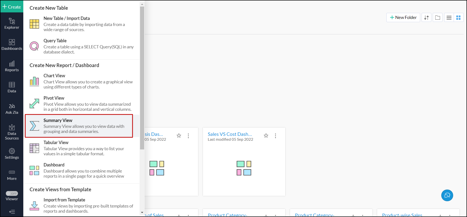 • Open the required workspace, click + Create from the side pane, and choose Summary View.