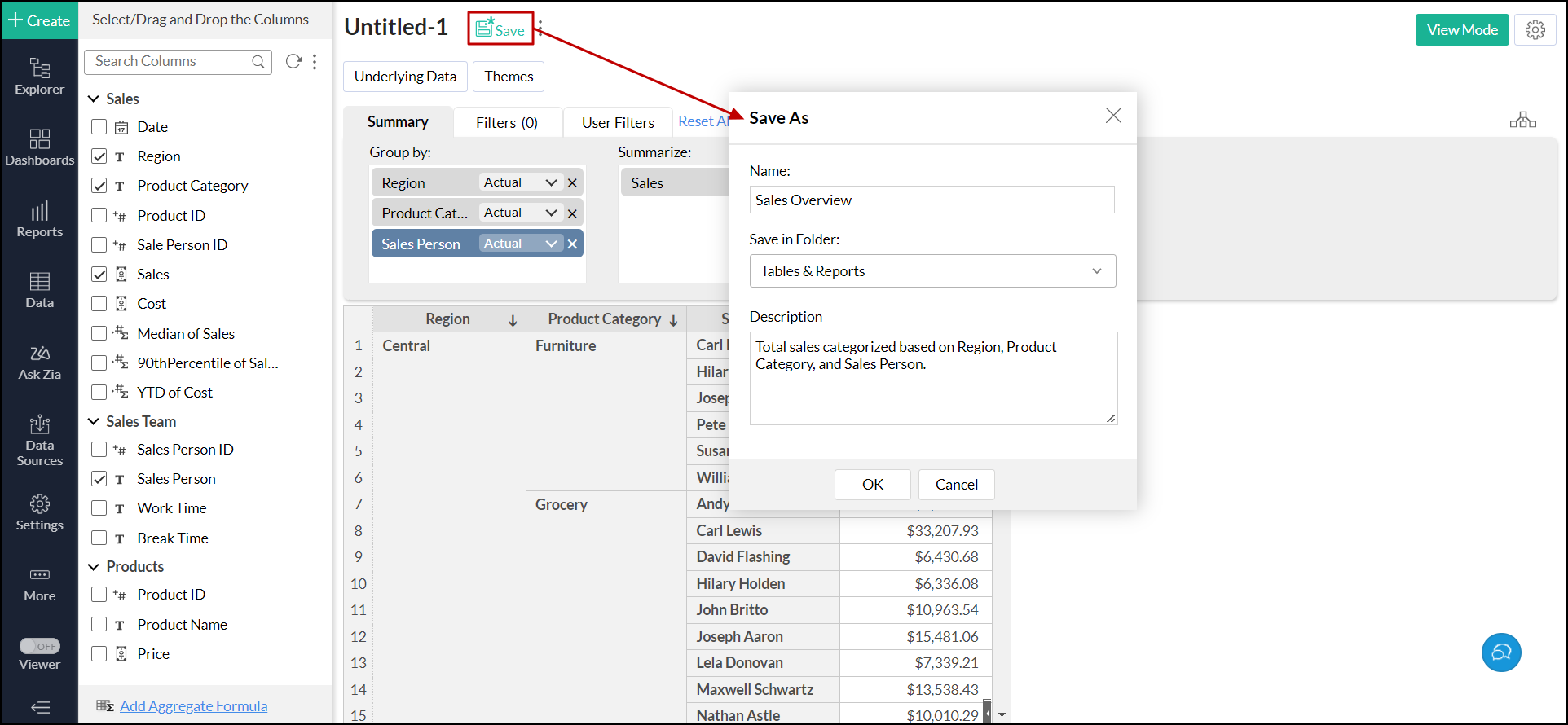 • Click the Save link that appears next to the report's name. In the pop-up that appears, provide a name and description for the summary view, choose the destination folder, and click OK.