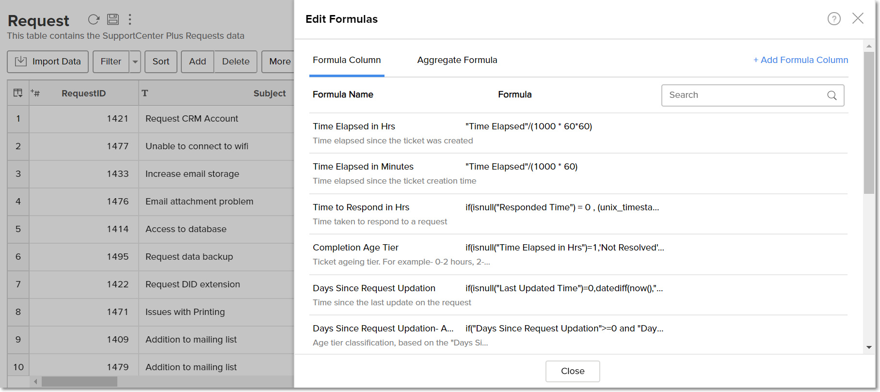 Formulas are calculations that can be defined using the powerful formula engine in Analytics Plus, to create required reports. Refer this documentation to know more. There are also several default formulas created based on the SupportCenter Plus modules. To view the default formulas, open the required table, click Add and select the Edit Formulas option.