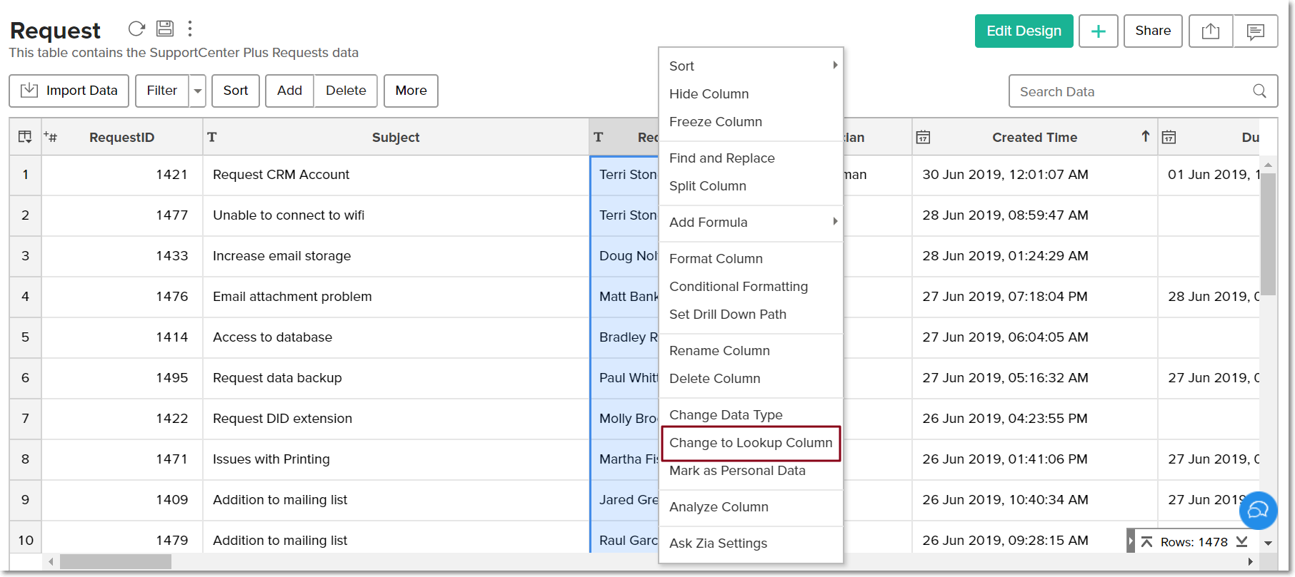 Yes. To do this, import or add a new table to the SupportCenter Plus workspace and define a lookup relationship between the added data and the existing data in the workspace. To define a lookup relationship between two tables, it is essential that the tables have at least one column in common between them. Follow the below steps to establish a lookup relationship.