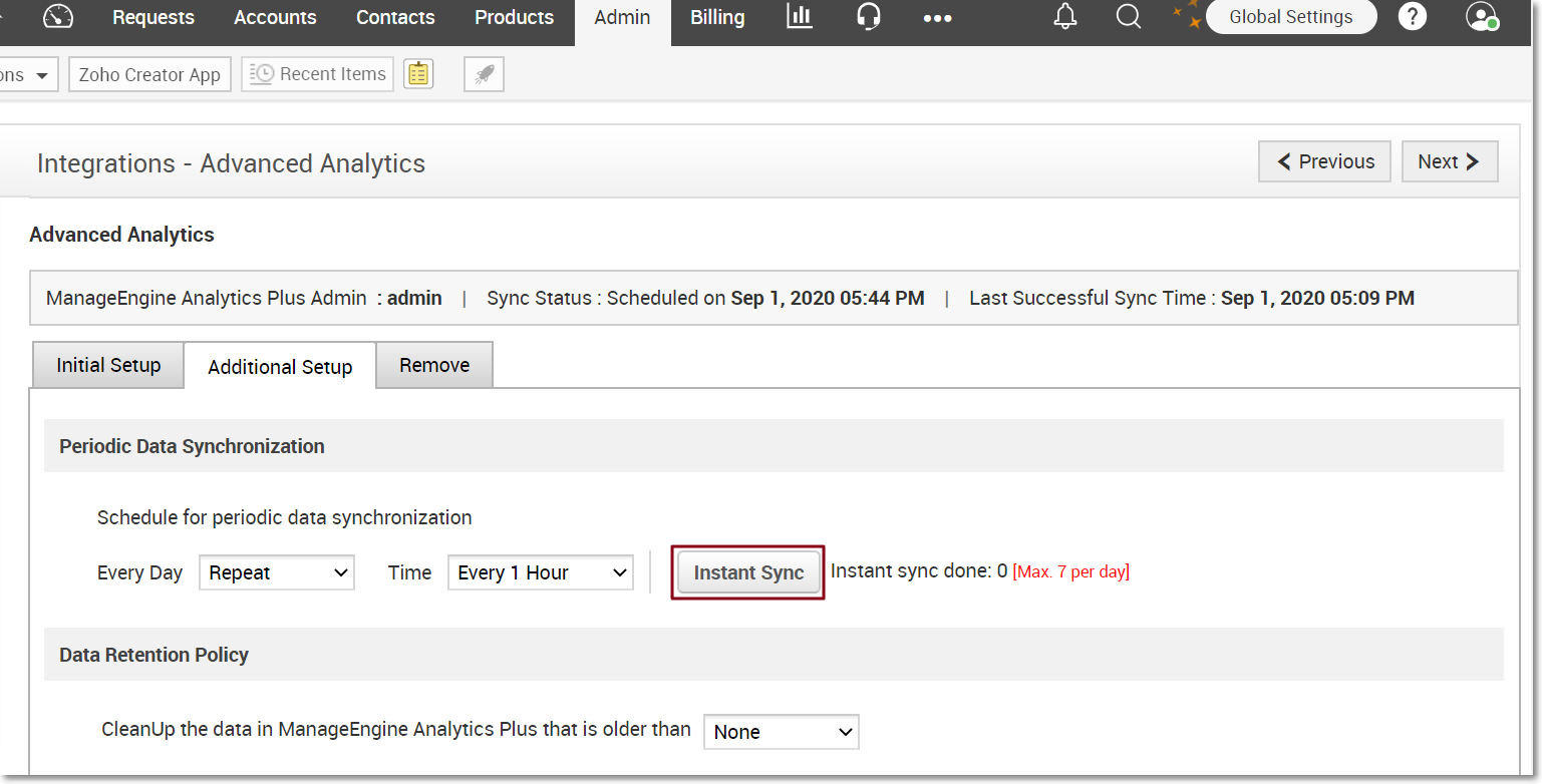 Yes. To do this, open your SupportCenter Plus application. Navigate to Admin > Advanced Analytics, and click the Additional Setup tab. The Instant Sync button allows you to trigger a data synchronization manually. This action can be done a maximum of seven times in a day.