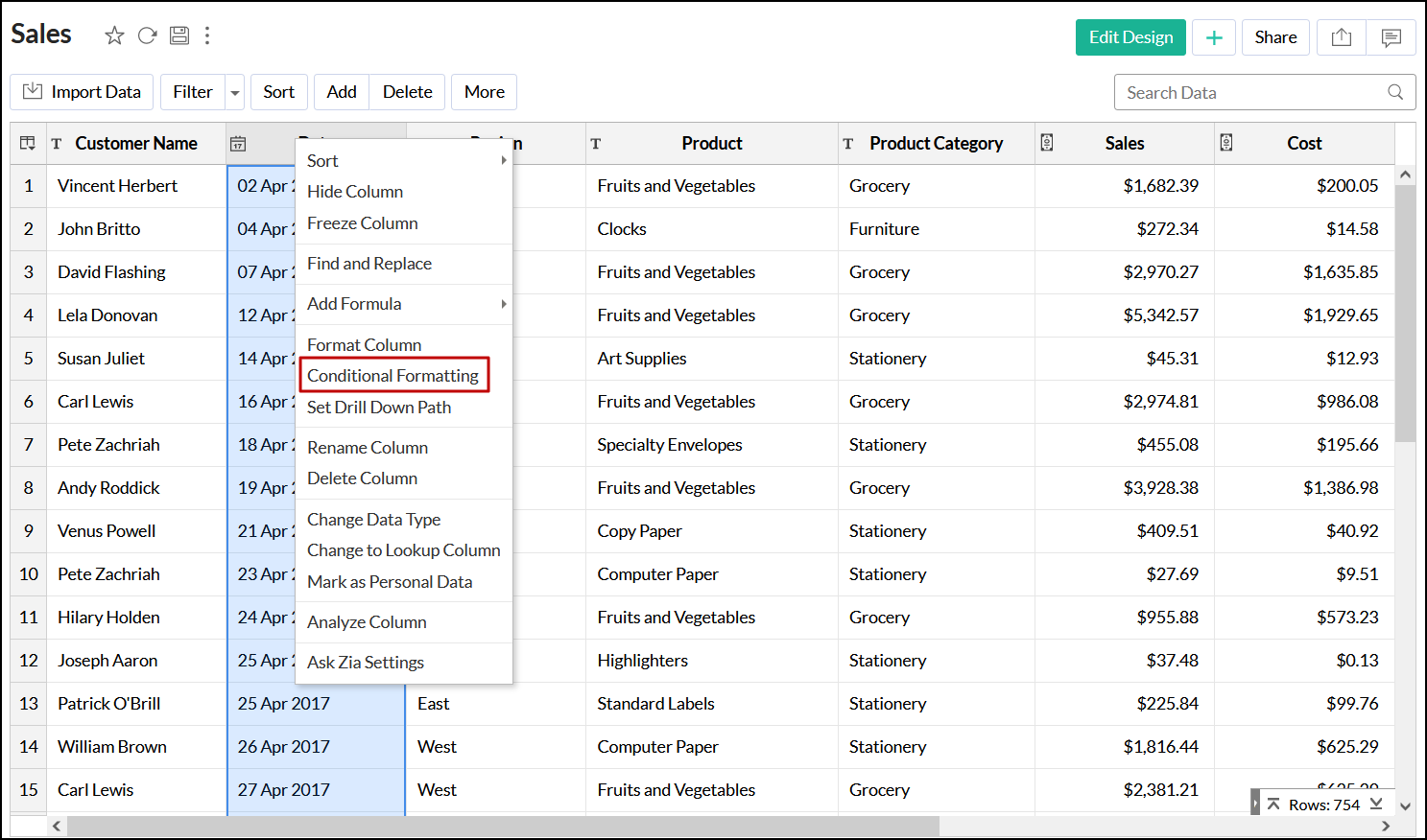 Analytics Plus allows you to highlight cells in a column with different background and font colors based on a specified condition. When the data in a cell satisfies the condition, Analytics Plus applies the corresponding formatting style to the table cell. To apply conditional formatting, follow the steps below.