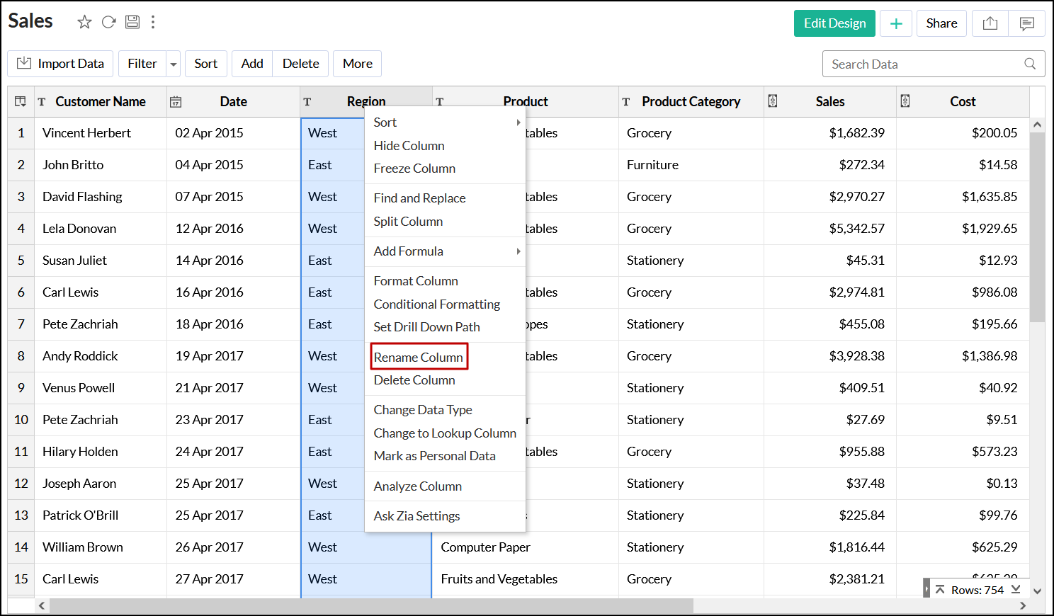 Analytics Plus lets you change the properties, such as format, name, data type, etc., of a column at any time. Refer to the following sections to learn about each option in detail. Please note that the changing column properties option is disabled for shared users.