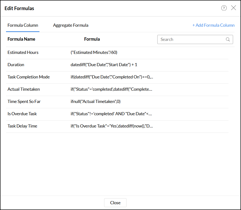 Formulas are calculations that can be defined using the powerful formula engine to create required reports. Refer this documentation to know more. There are also several default formulas created based on the Teamwork Projects modules. To view the default formulas, open the required table, click Add and select the Edit Formulas option.