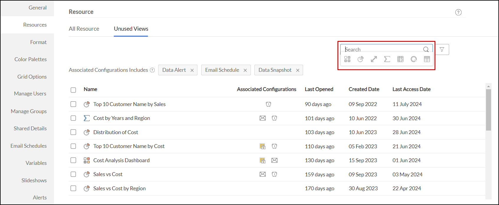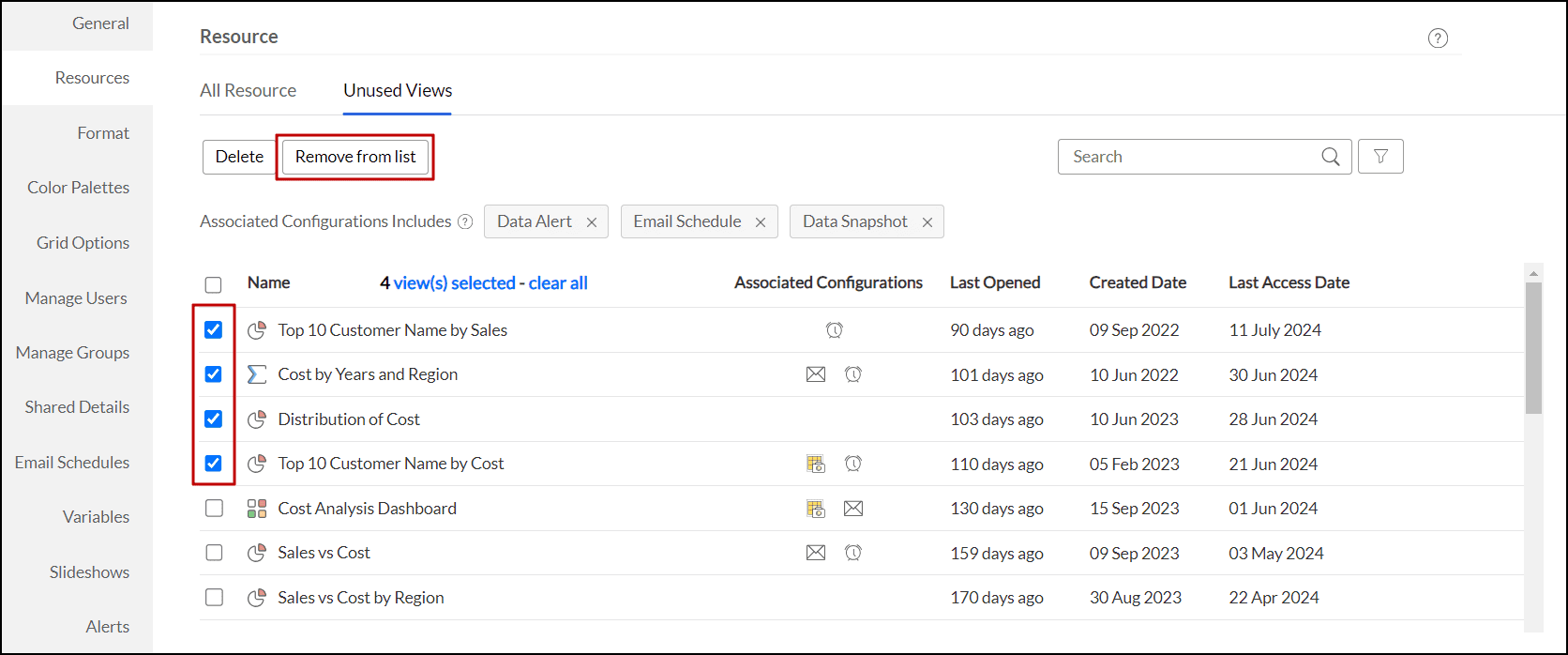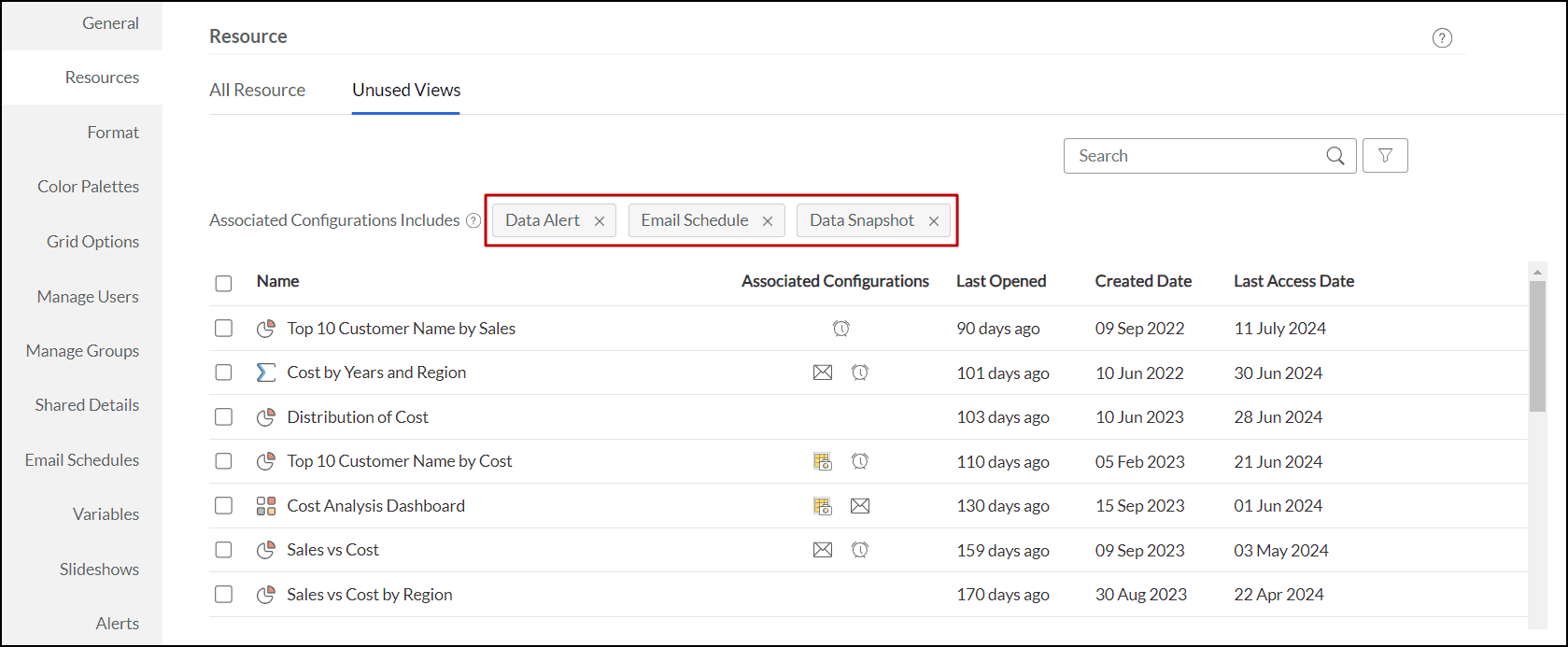 Analytics Plus offers filters to allow users to look at the list based on associated configurations such as Data Alerts, Email Schedules, and Data Snapshots. You can customize these filters to view specific combinations or exclude certain ones to focus on views that you wish to consider for removal.
