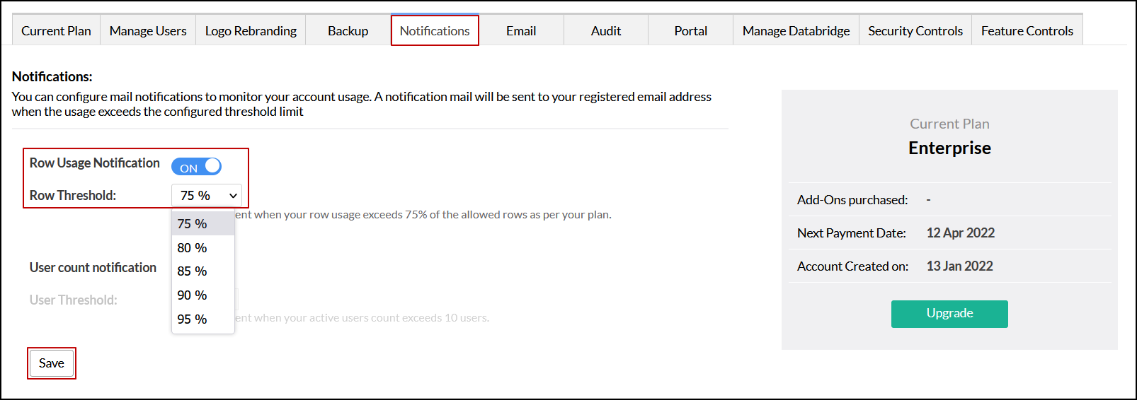 Analytics Plus triggers a notification email to the registered email address when the table row usage count exceeds the configured threshold. To configure the row usage notification, follow the steps below.