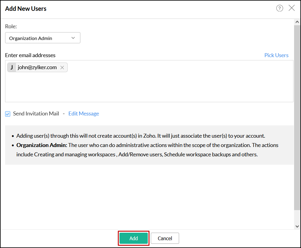 - Enable or disable the Send Invitation Mail checkbox to send an email invitation to all the users being added. You can also customize the email message by clicking the Edit Message link.