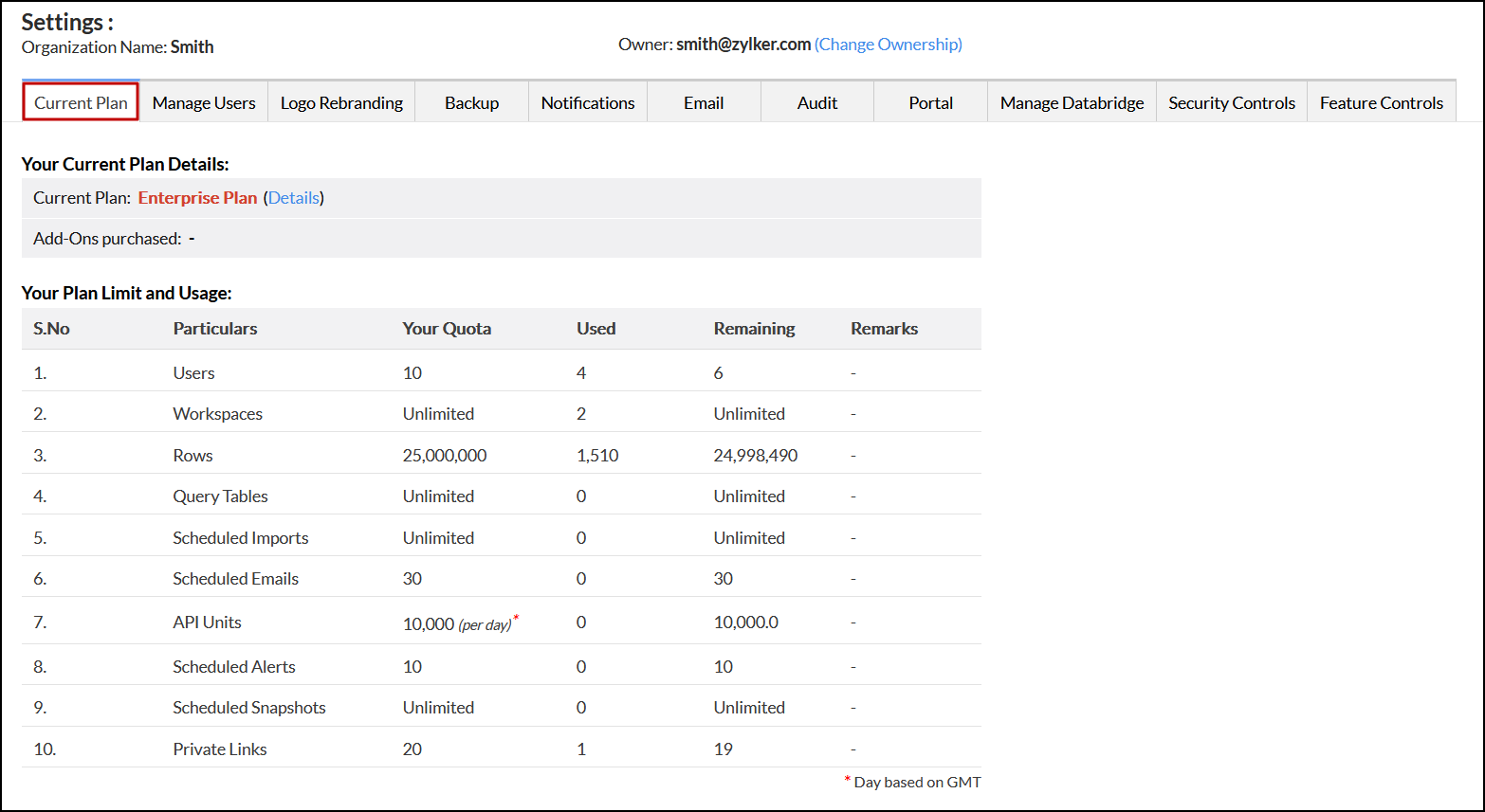 Analytics Plus allows you to add users based on your Organization subscription plan. The Account Administrator, Workspace Administrator, and any user with whom you share data (tables, reports, dashboards, and workspaces) are considered as a user for your account. You can check your user limit from the Current Plan tab from the Settings page.