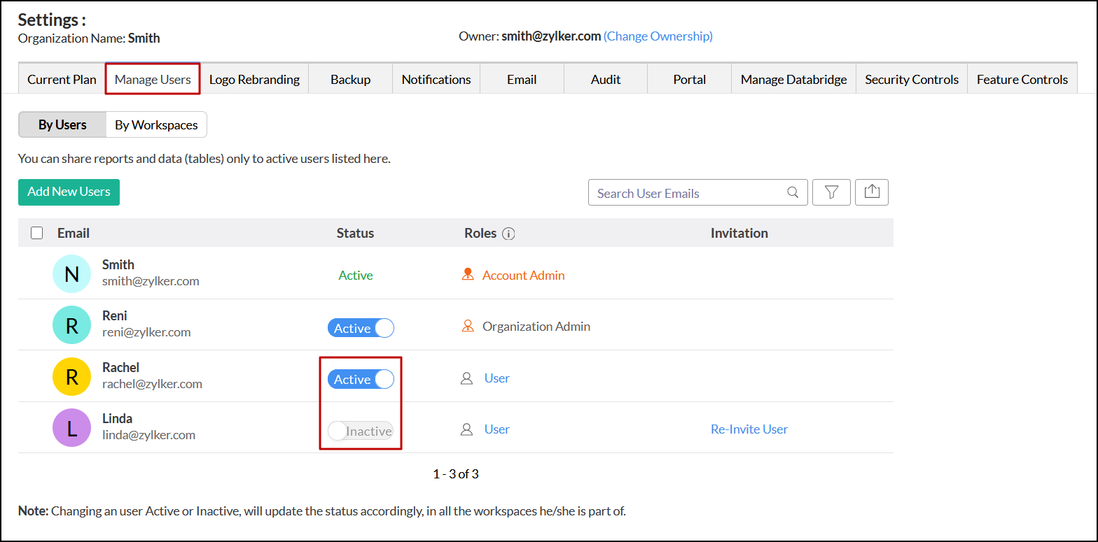 Analytics Plus allows you to manage all the users in your Organization using the Manage Users tab in the Settings page. All users added to your Organization will be listed here. You can add, remove, change role, activate, and deactivate users from here.