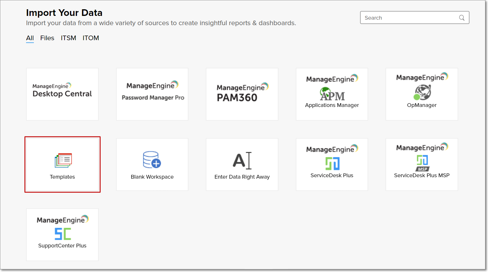 • Log in to Analytics Plus, click on the Import Your Data button found at the top right corner of the screen, and select the Templates option.