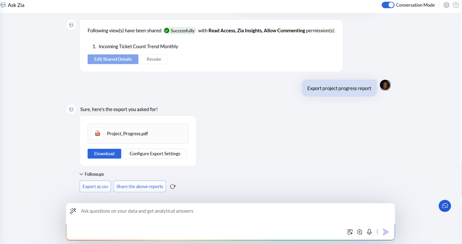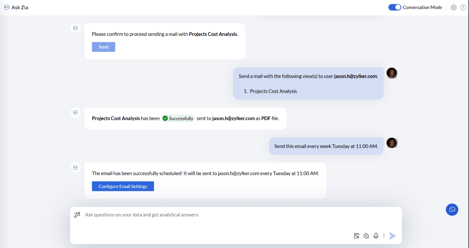Action Skills in Ask Zia allow you to share reports and dashboards, schedule emails, and export visualizations, instantly with team mates through simple prompts. These actions can be performed seamlessly within the Ask Zia Agentic AI portal.
