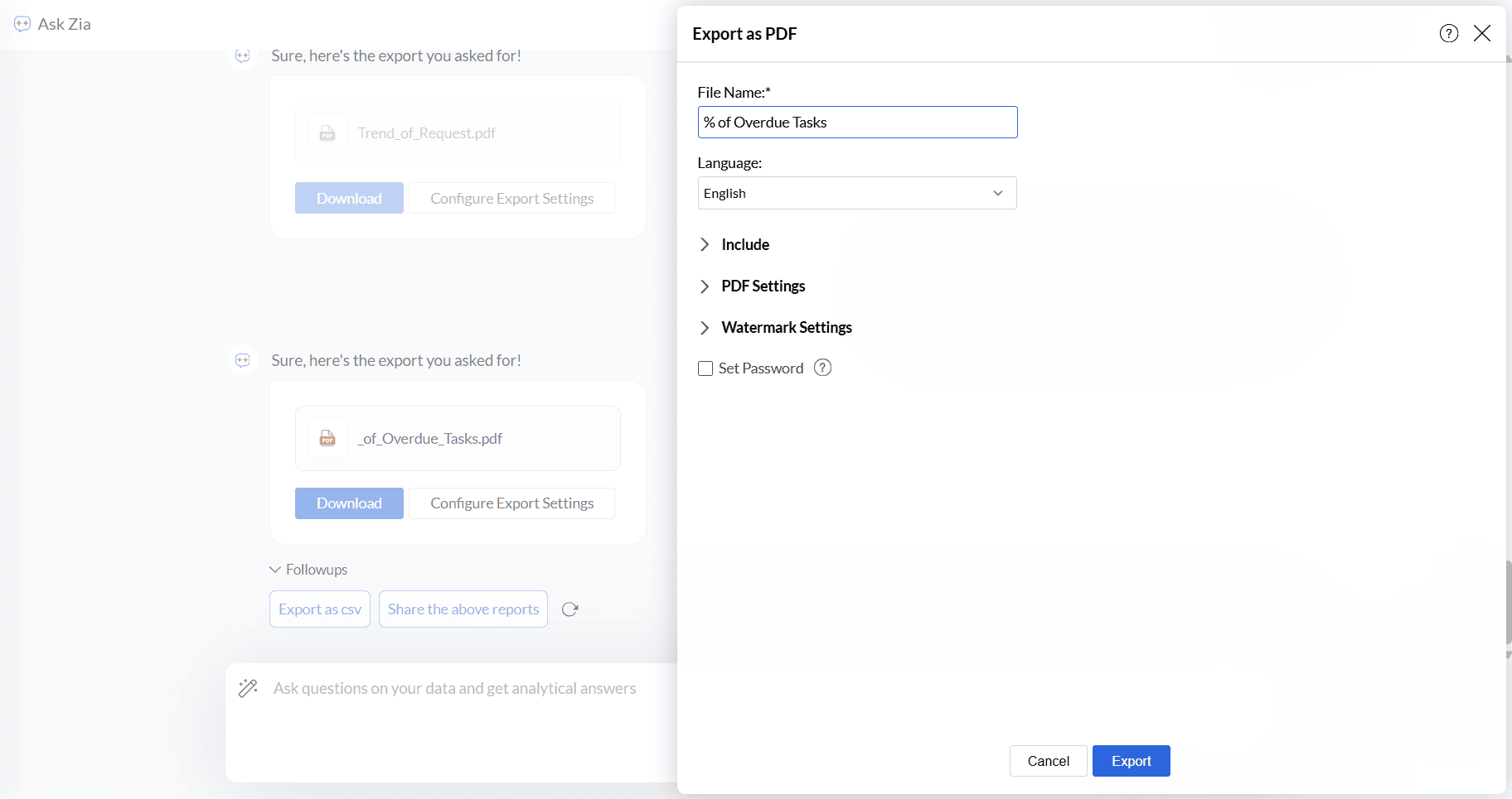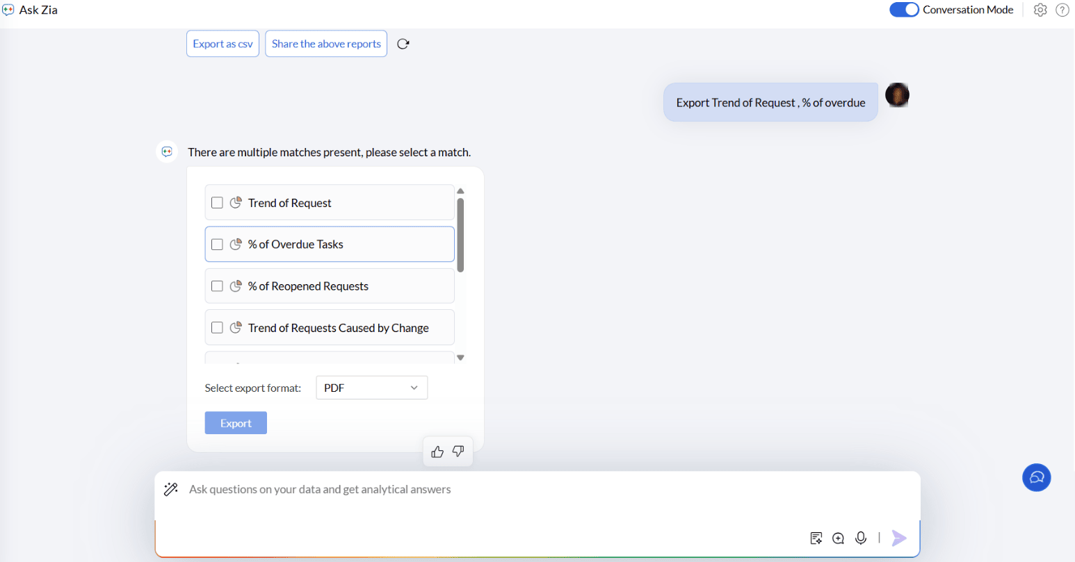 If there are one or more similar names, Ask Zia will display all the matching reports. Select the view you wish to export.
