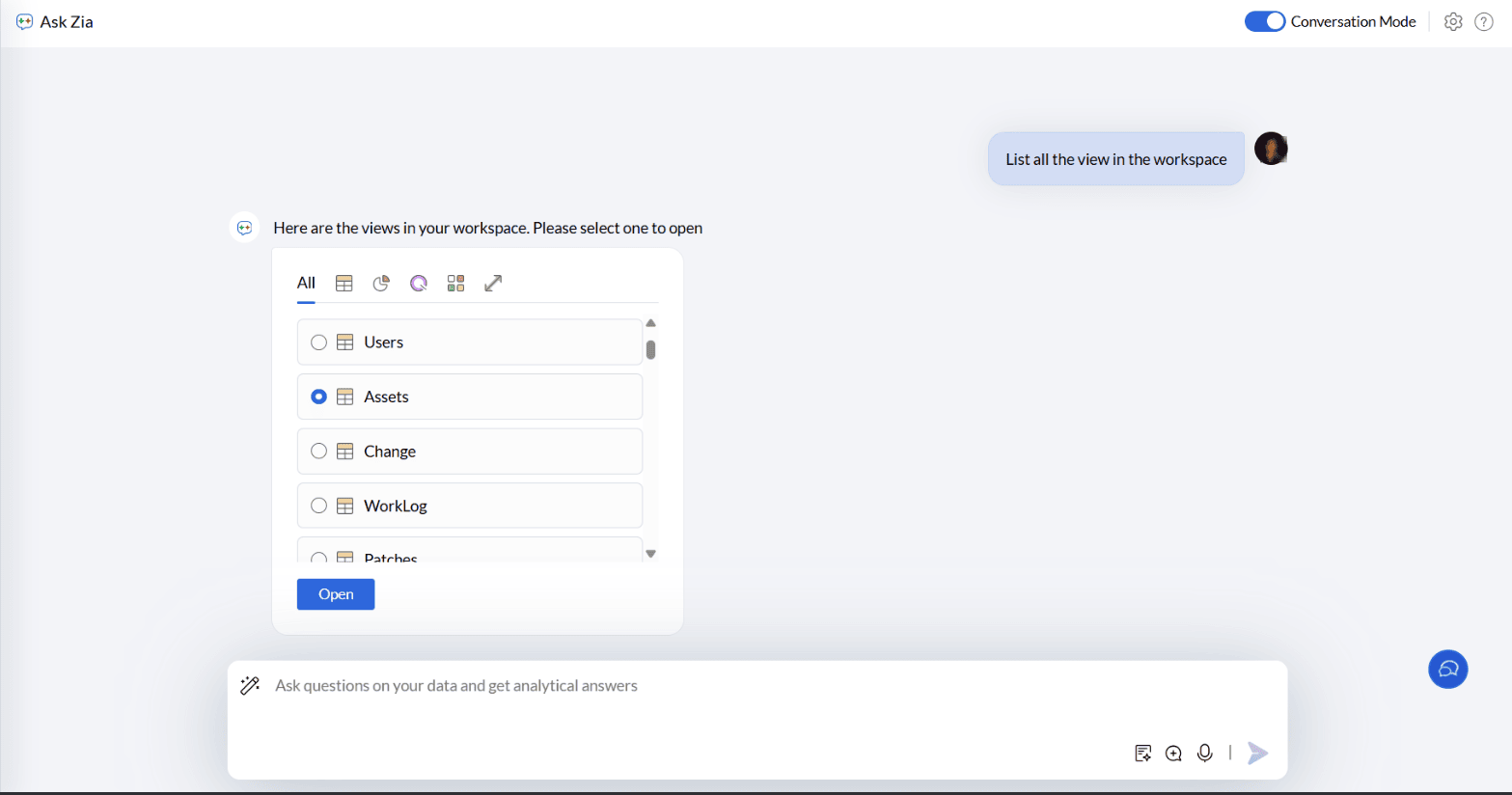 2. Ask Zia will display all the views in the workspace. It categorizes the views as charts, tables, and pivot tables.