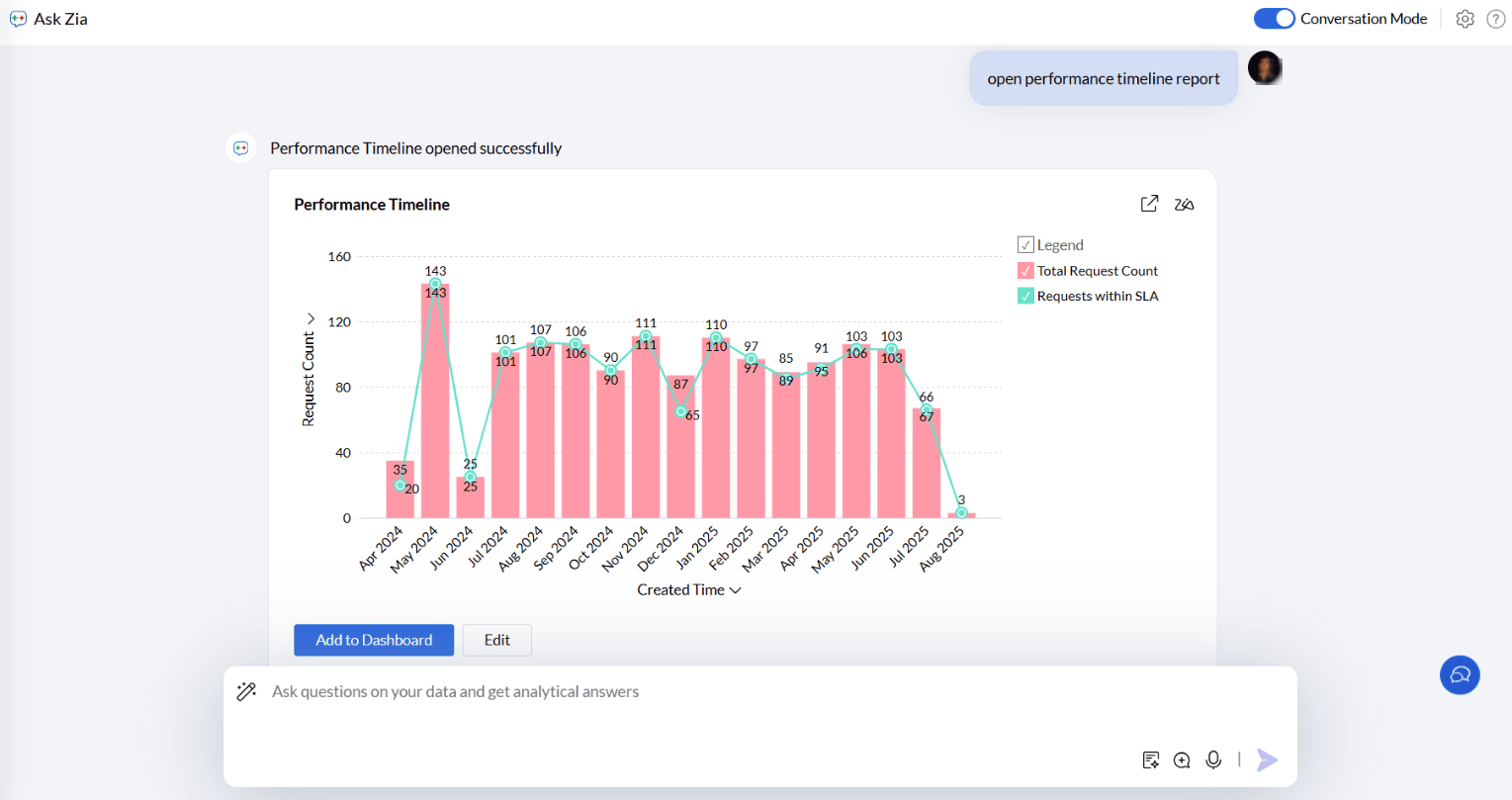 The Open View action displays the report within the Ask Zia portal, providing additional options to add it to a dashboard, edit the view, or open it in a new tab for detailed exploration.