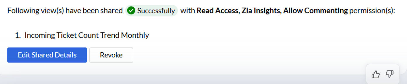 In the prompt section, type Share the following {View Names} to the {user email id}. Synonyms like send, forward, and deliver can be used in the prompts. Once entered, Ask Zia will prompt for confirmation of the sharing permissions.