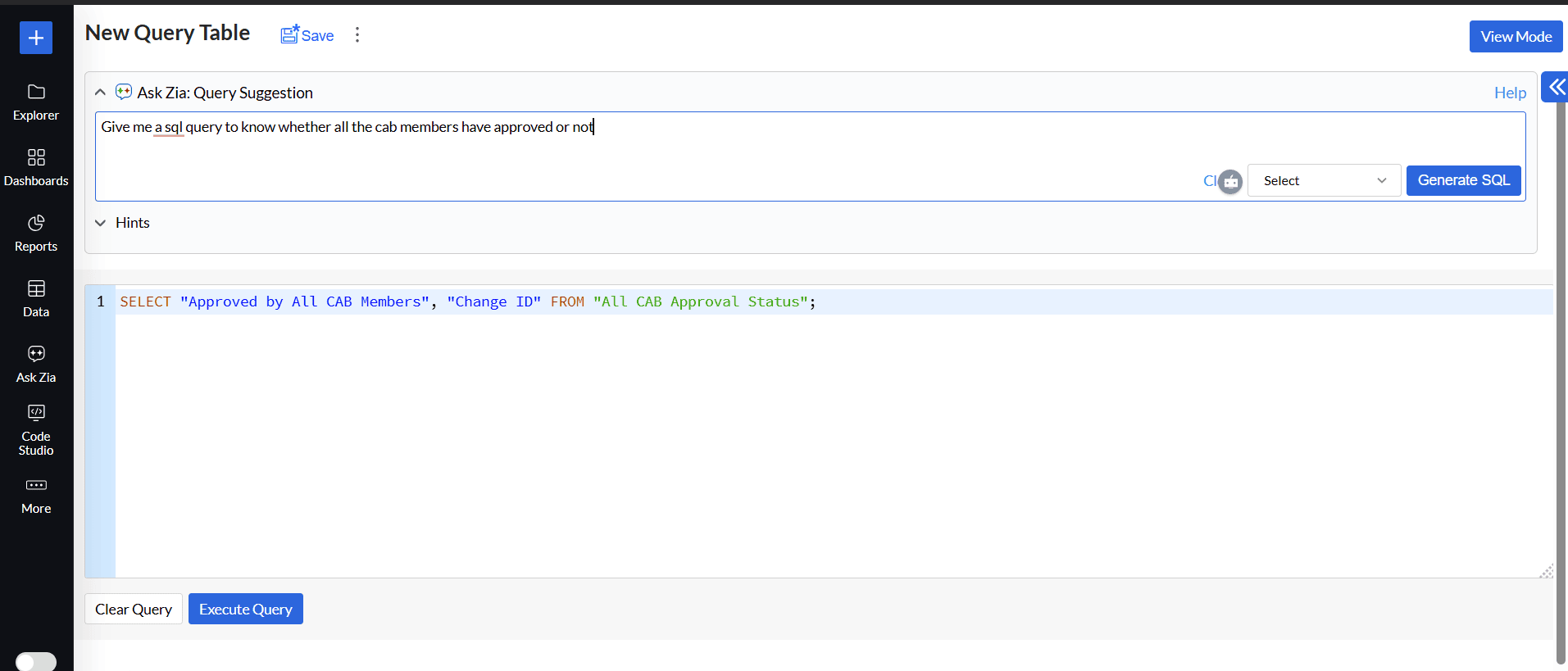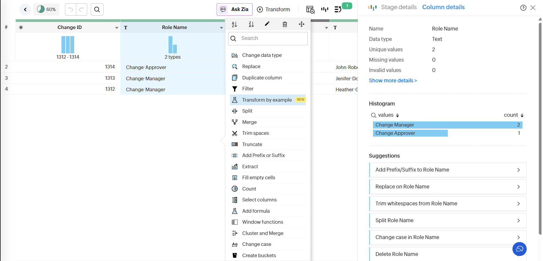 The Formula Suggestion feature lets you create calculated fields or transformations in plain language. Ask Zia will generate the required formula, which you can review and modify before applying.