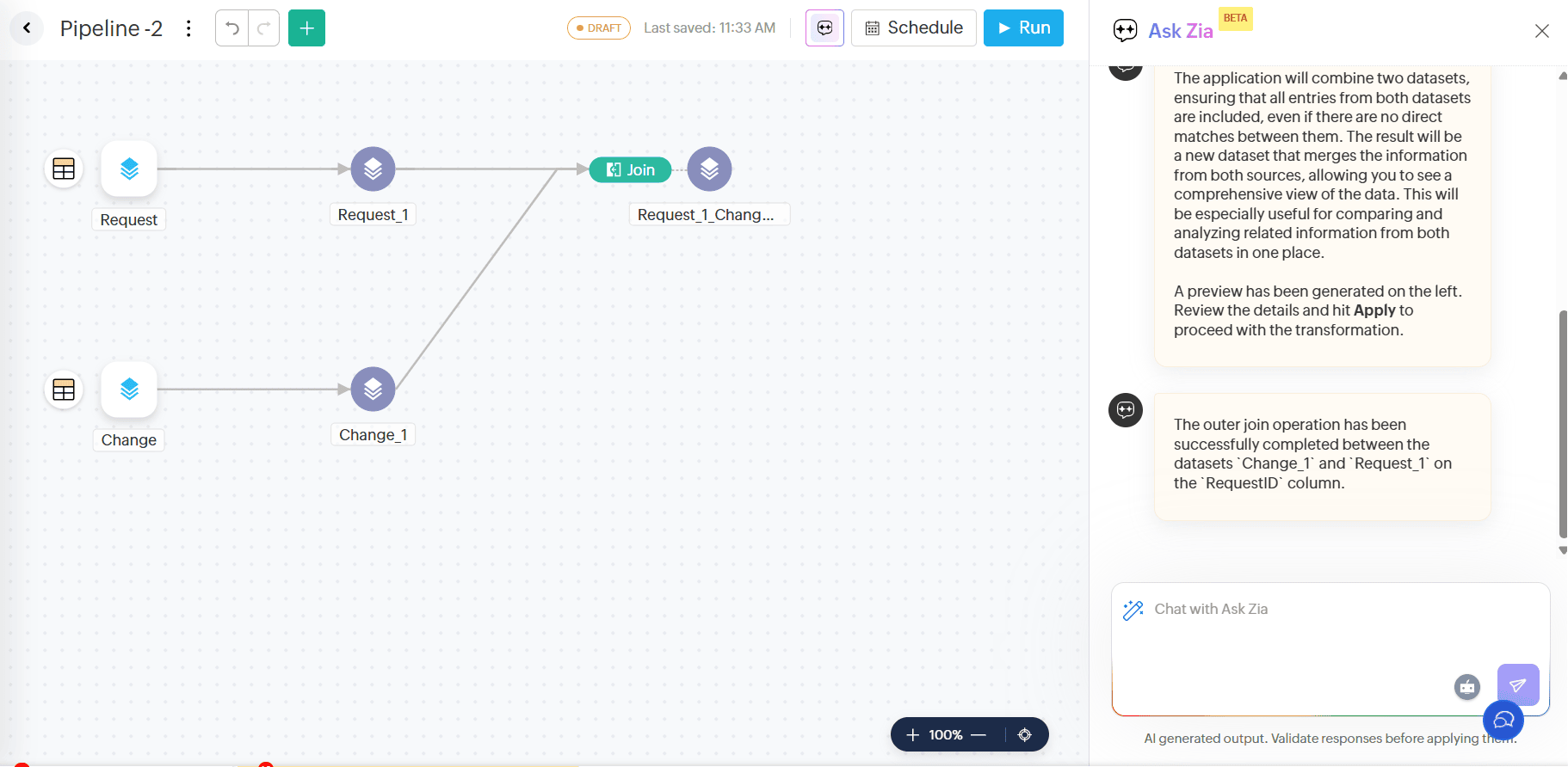 With Ask Zia in Pipeline Builder, you can import data from various sources, apply transformations, and export it to different destinations. You can also schedule the pipeline using Ask-Zia.