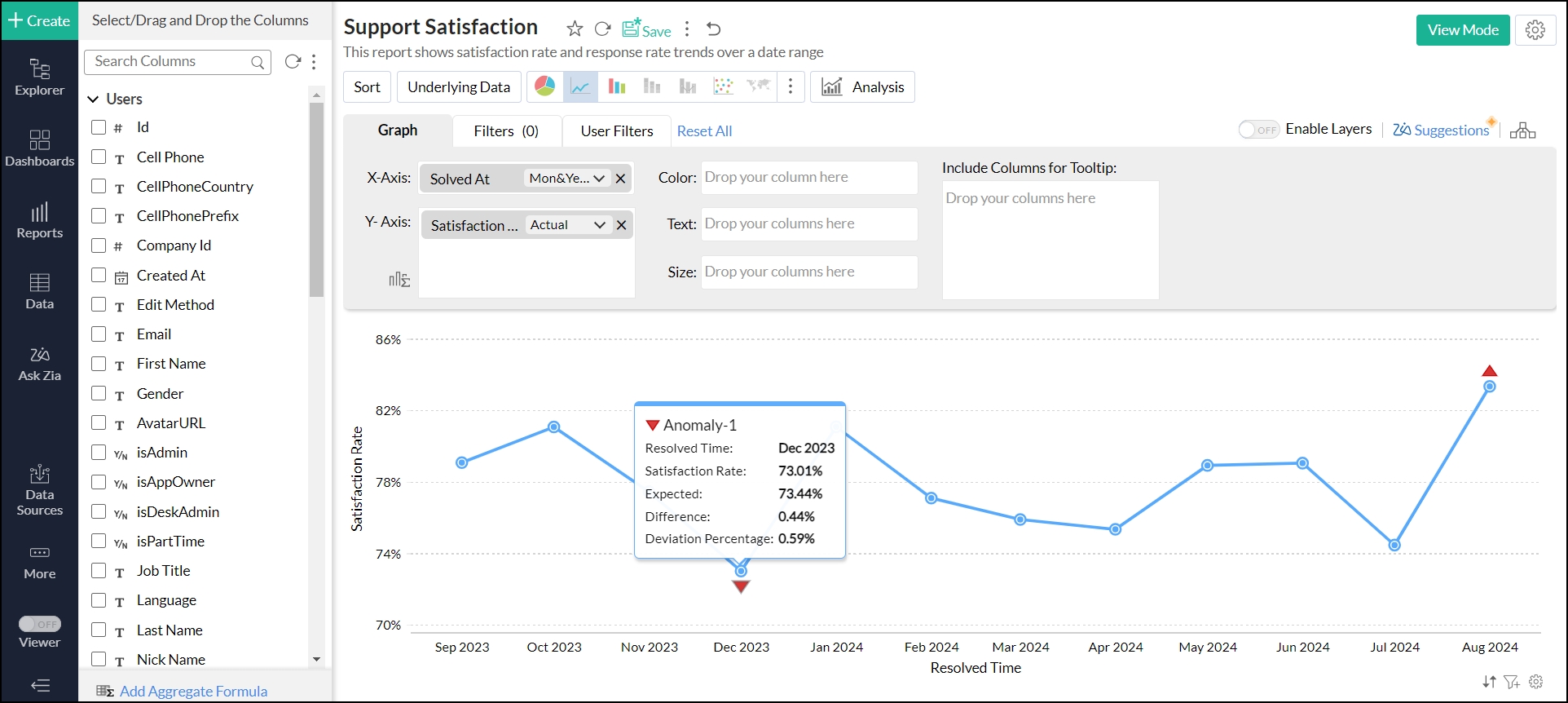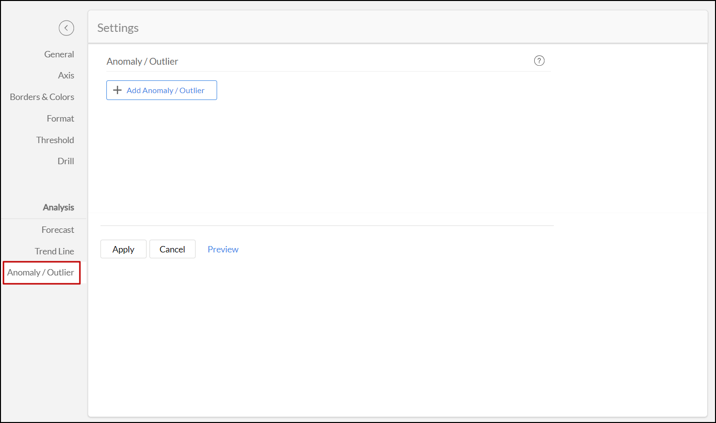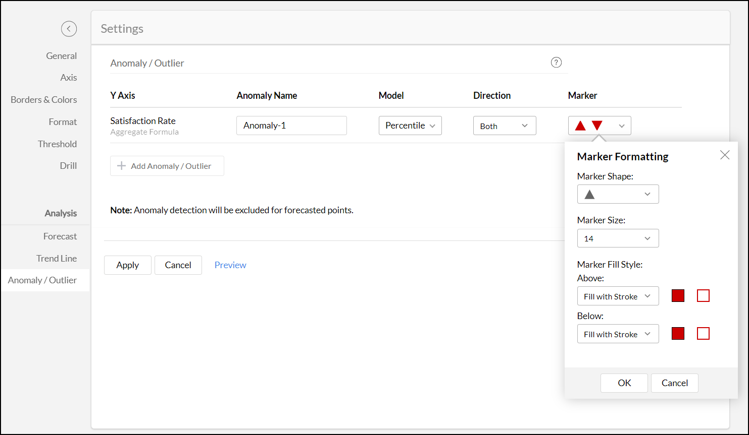 - Anomaly or outlier detection is supported for all types of line and bar charts.
