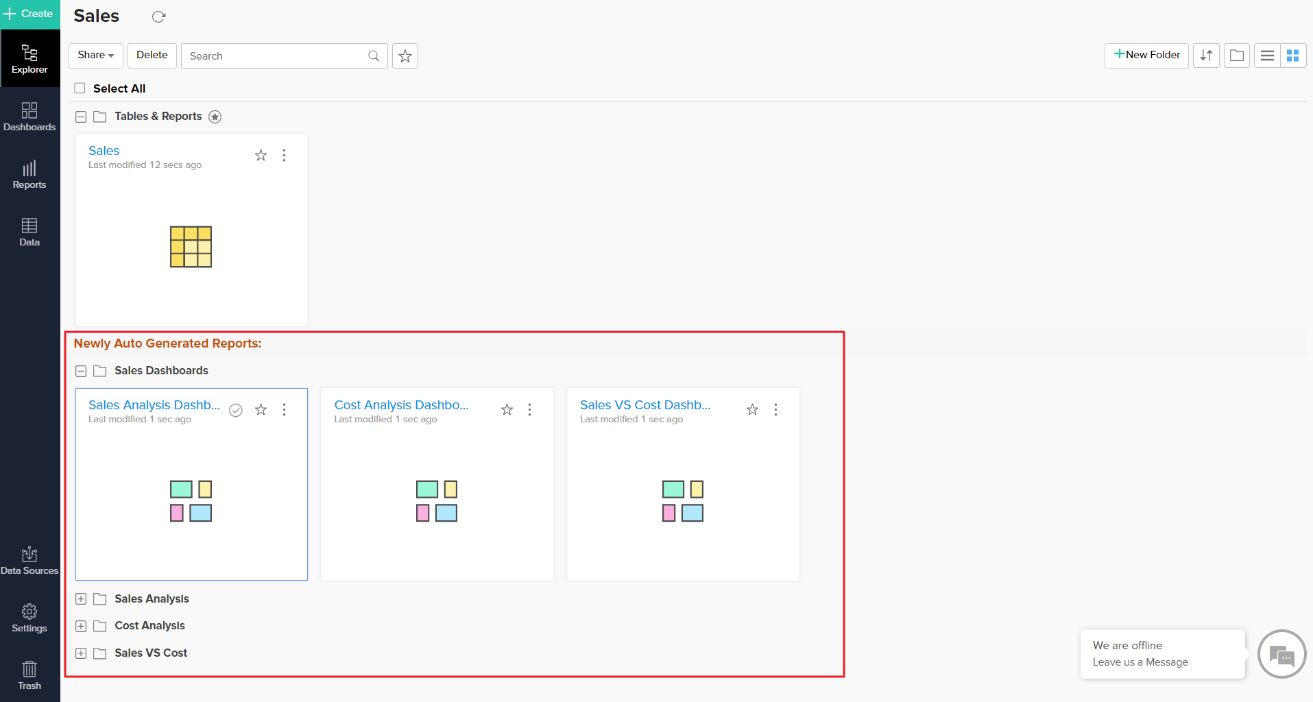 - This action will automatically generate multiple reports and dashboards, and group them into folder(s). You can access the newly generated reports from the Newly Auto Generated Reports folder in the explorer bar.