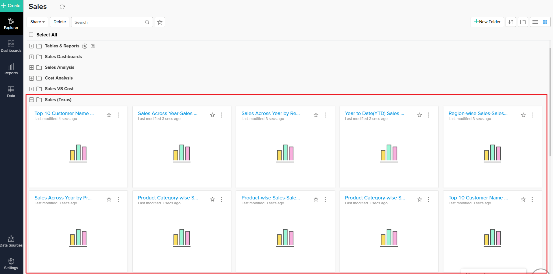 - Now you can access the newly created reports and dashboards from the explorer bar under the folder you selected in the previous step.