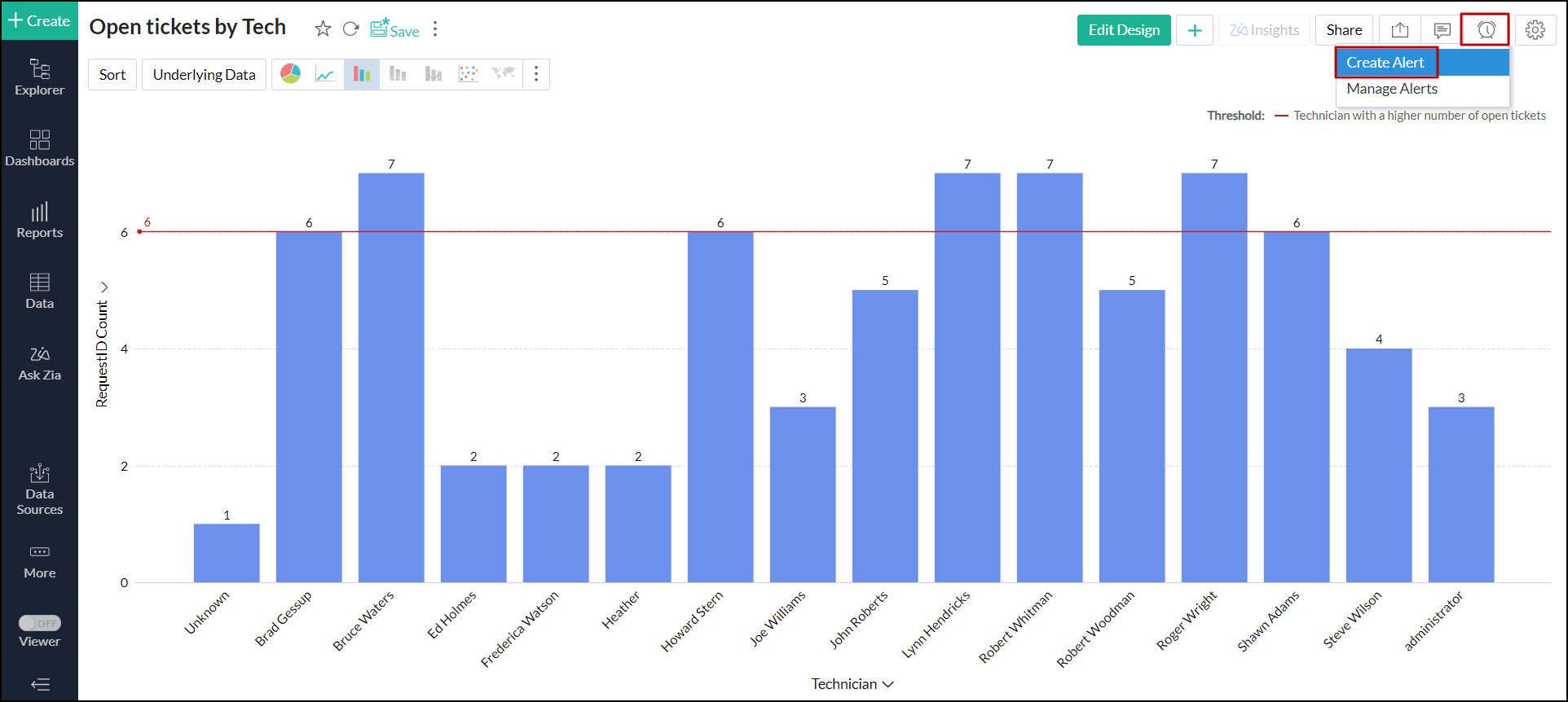 Analytics Plus allows you to set up alerts based on thresholds for specific views. A threshold is a predefined value that acts as a benchmark for data points. When values exceed this threshold, an alert is triggered, facilitating the monitoring and response to significant changes. To create alerts over thresholds, follow the steps below.