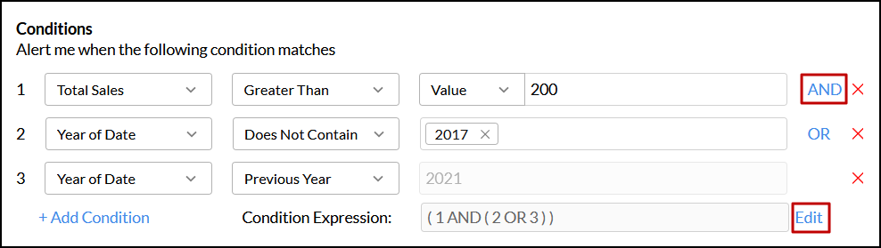 Analytics Plus allows you to create conditions with both AND and OR conditions. When you add multiple conditions, Analytics Plus uses the AND condition by default. To switch between AND and OR, click on the corresponding condition. You can also edit the conditions by clicking the Edit link corresponding to the Condition Expression textbox.