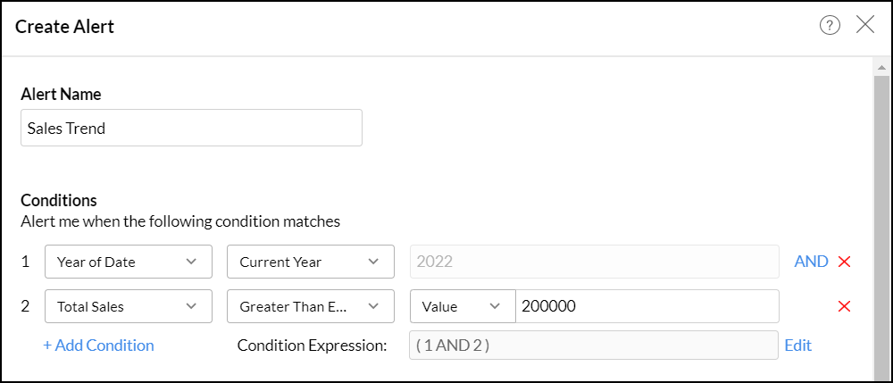 • In the dialog that appears, provide a name for the alert and create conditions based on which the alert must be triggered. Click here to learn about creating conditions.