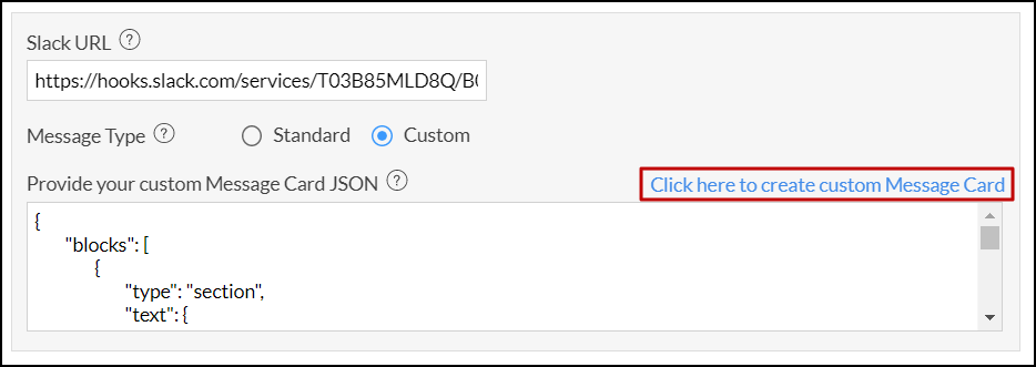 • Custom: For custom message type, create your custom message card and paste it in the Provide your custom Message Card JSON text field. Click the Click here to create custom Message Card link to create your custom message in Slack.