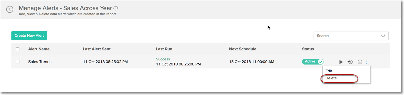 You can also manage the various alerts created over a specific report by clicking the Alert icon on the top right corner of the report, and clicking the Manage Alerts icon.