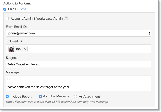 Note: The size of the attached report varies depending on the data in your current view. If the size exceeds 15MB, the notification mail will be sent to users without the report.