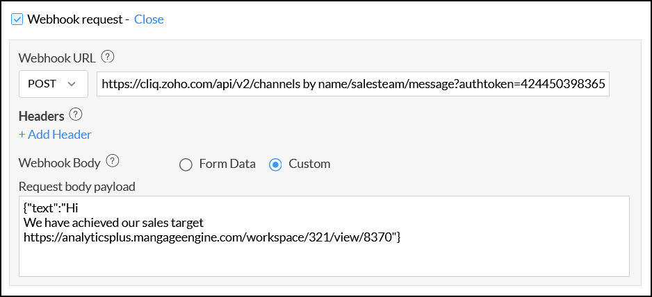 Webhook request in Analytics Plus enables you to post alert messages in various messaging services or trigger workflows in target applications when the data alert conditions are met (Click here to learn more about Webhooks). Follow the steps below to create a webhook request.