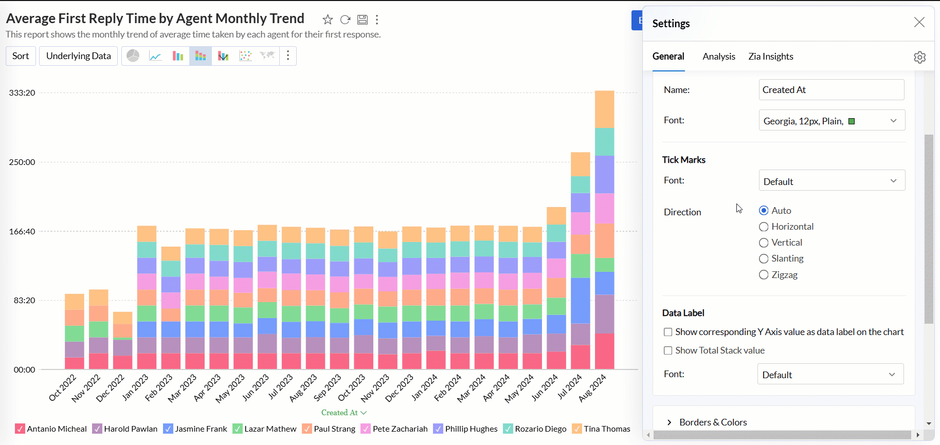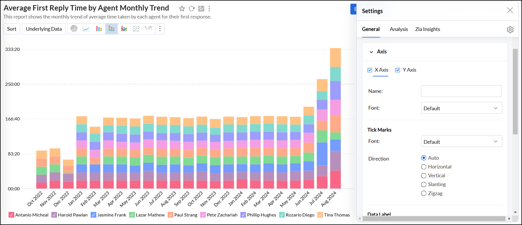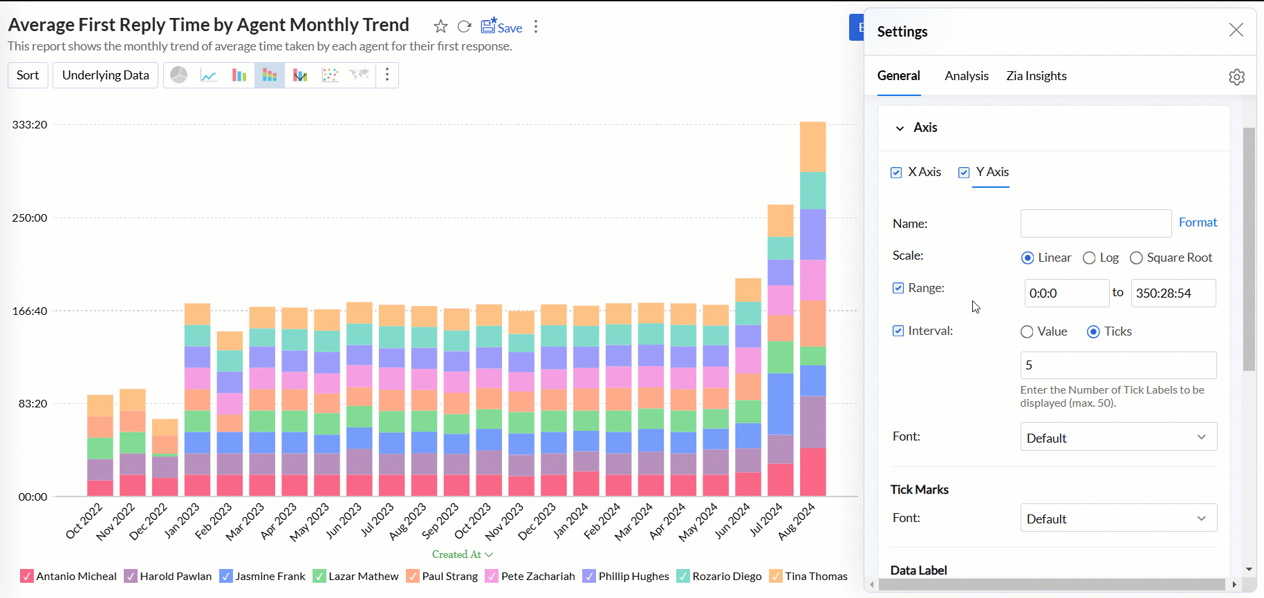 Analytics Plus automatically sets values for chart axes (X-axis and Y-axis) such as labels, axis range, interval between labels, etc. You can also customize these properties as required.