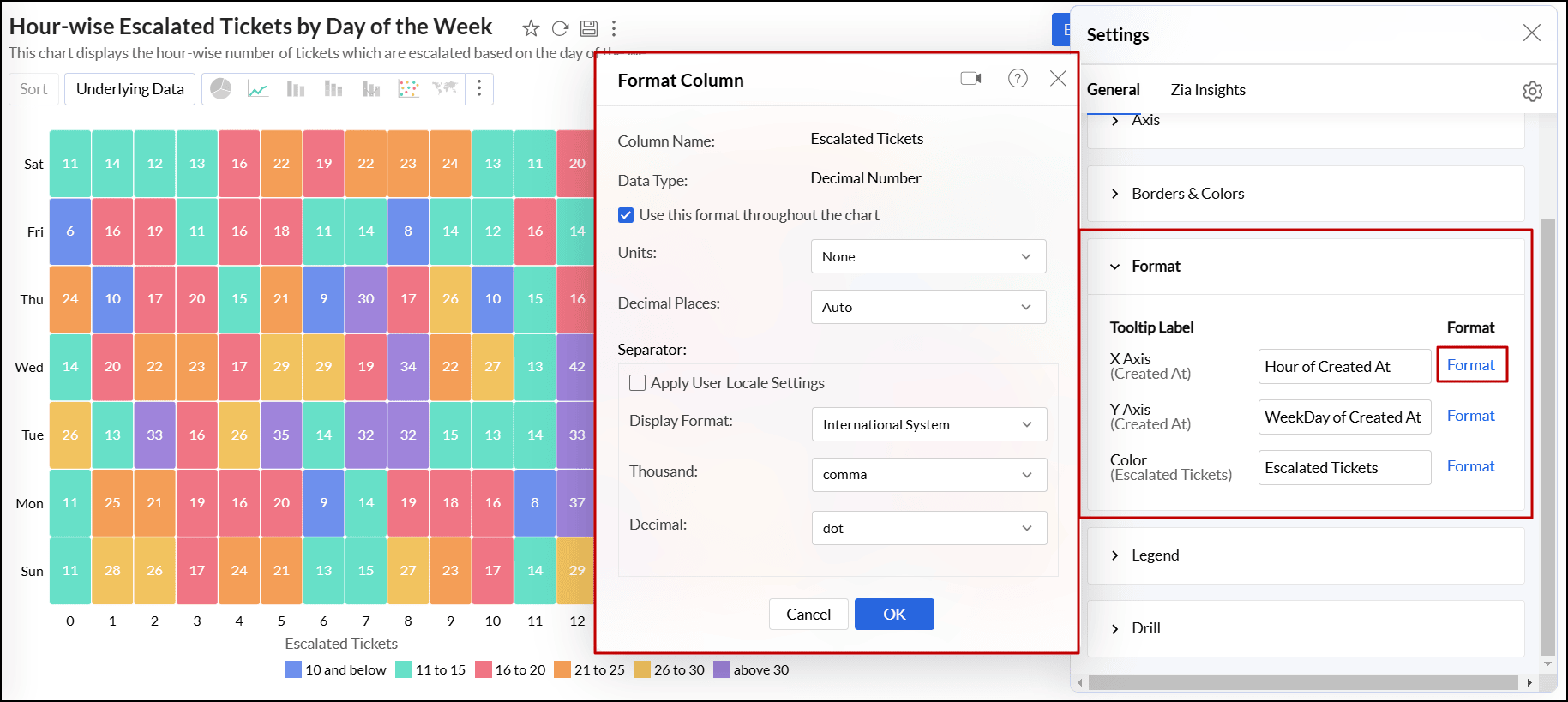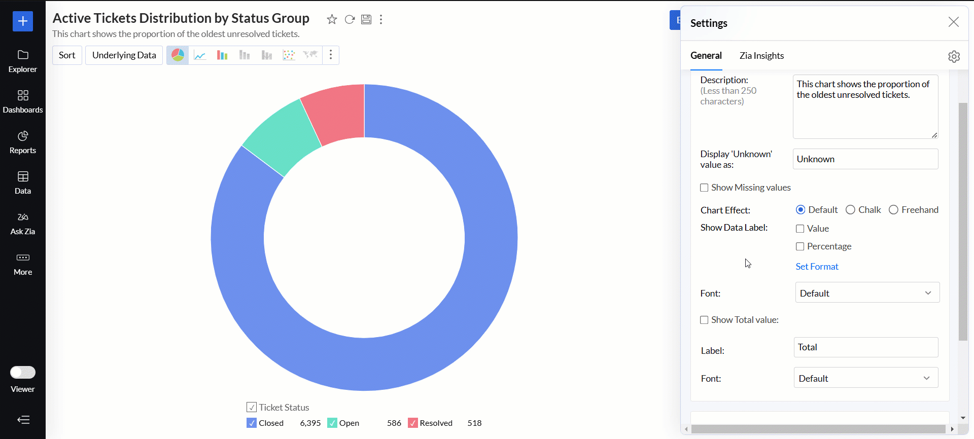 Analytics Plus lets you modify the format of a column, including options for alignment, decimal places, date formats, currency, symbols, and more. Depending on the data type, you can choose how to display the data in the chart.