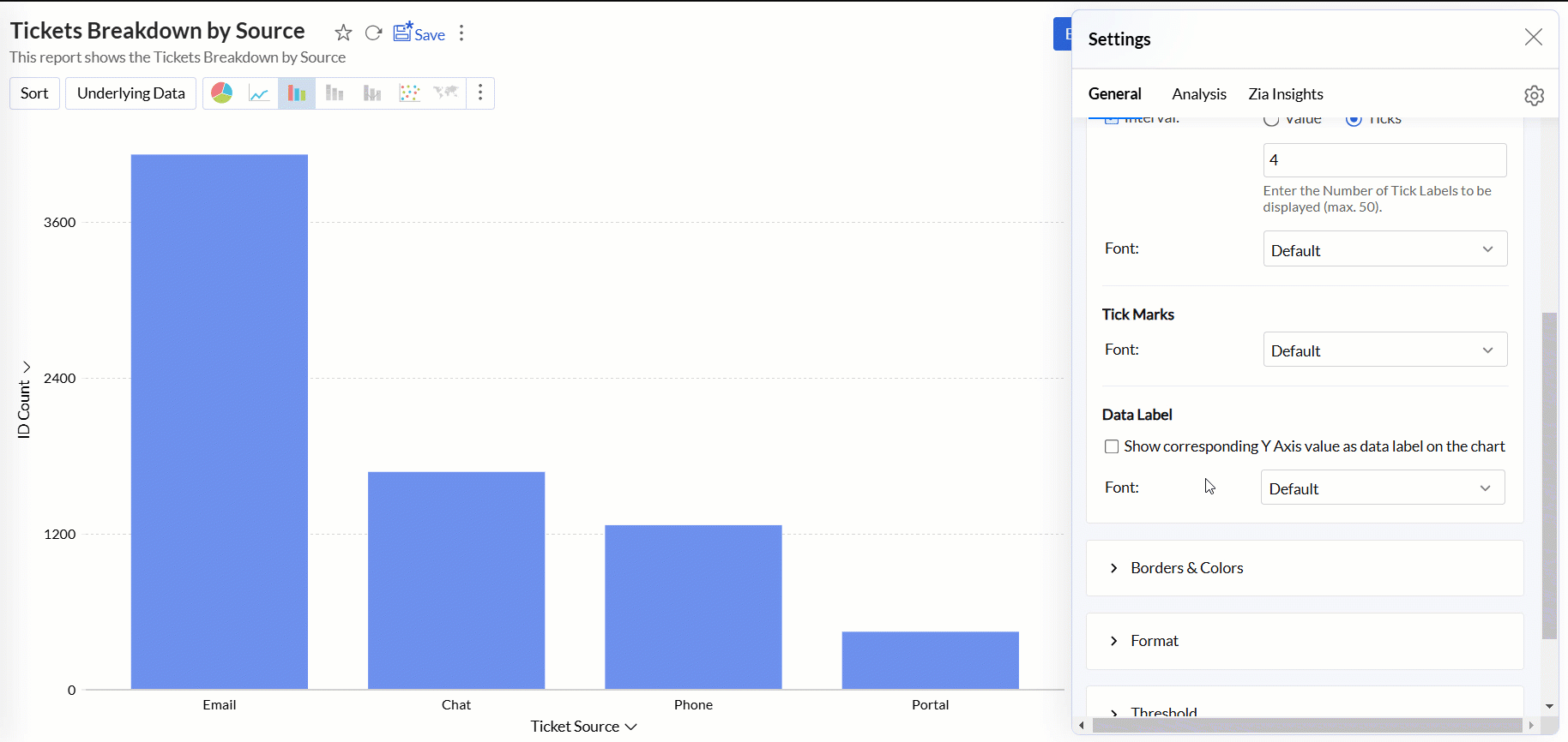 • Ticks: Refers to the number of tick labels you want to display along the axis, regardless of the interval between them.