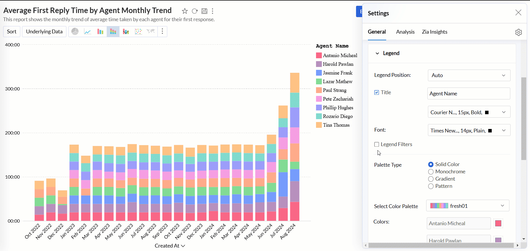 • Color Palette: This option enables you to choose the color palette you wish to apply to your data series. You can select a palette based on the selected Palette Type (Solid Color, Monochrome, or Gradient). Analytics Plus provides a predefined set of color palettes, and you also have the option to create and add custom palettes to fit your needs.