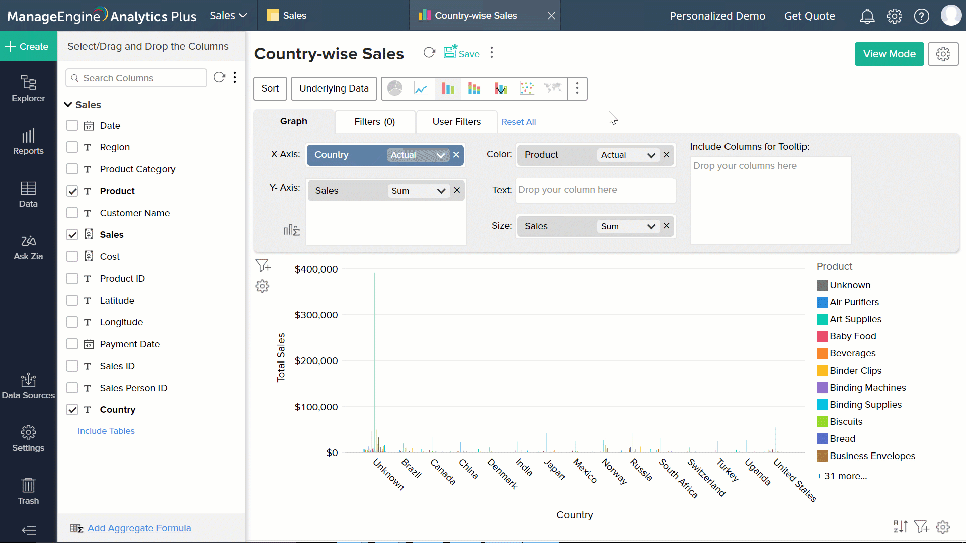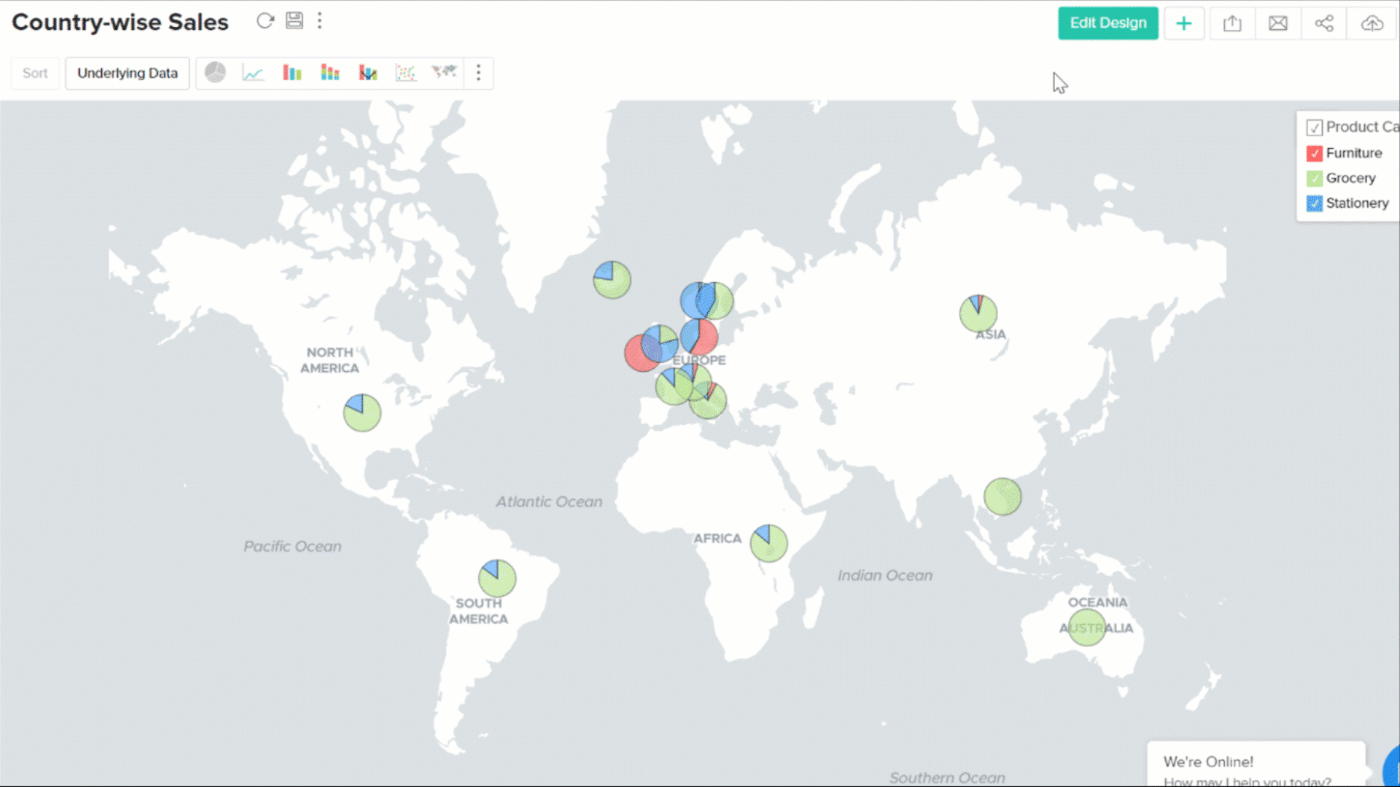 Analytics Plus allows you to visualize geographical data using map charts. To create a map chart, your data set should contain location-specific columns. During data import, Analytics Plus auto-identifies the columns that contain geographical data in your data set.