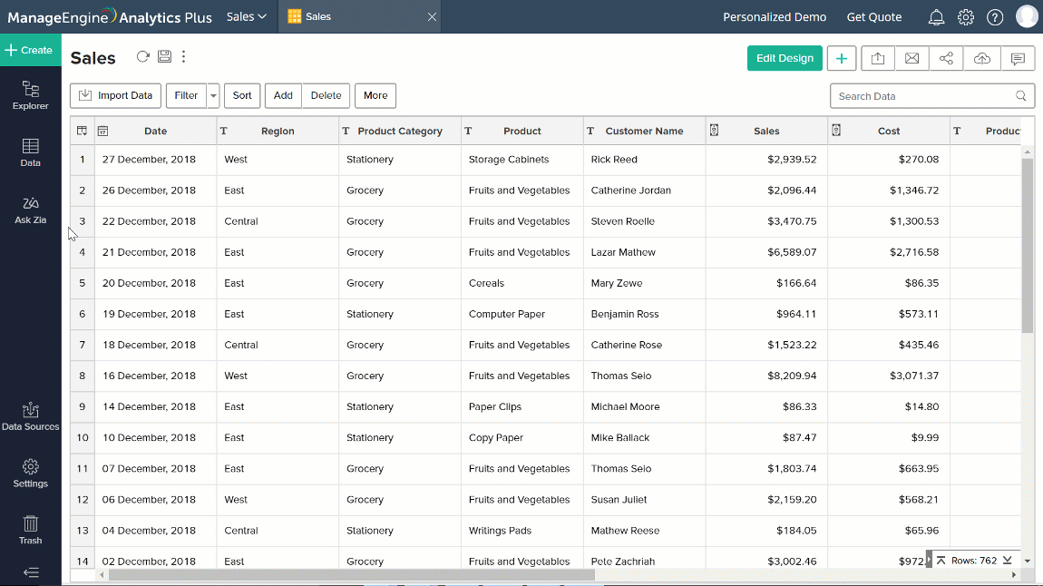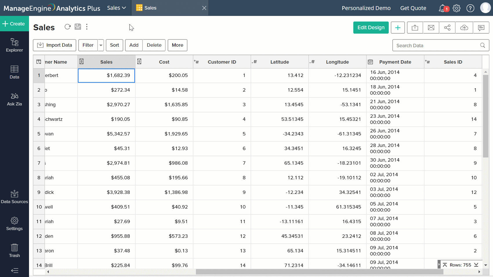 Analytics Plus will auto-identify geographical columns i.e. columns that contain information about continents, countries, counties, states/provinces and cities. However, to create map charts using columns containing zip code, or latitude and longitude, the data type of the column needs to be changed manually. To do this,