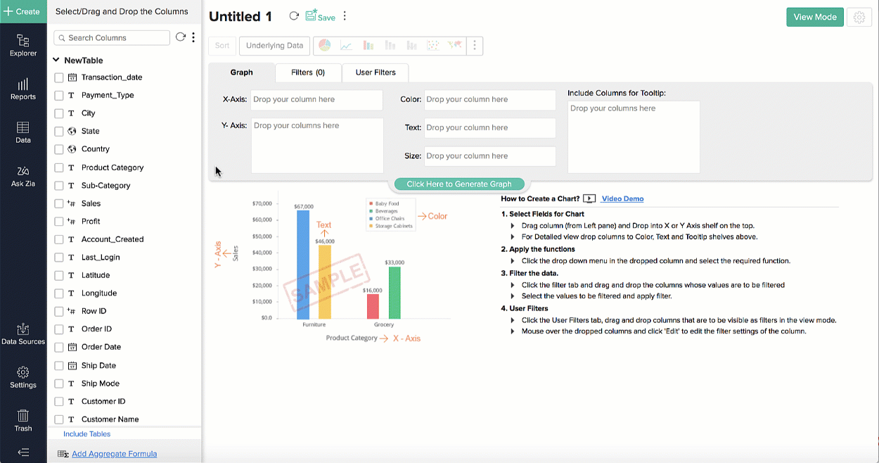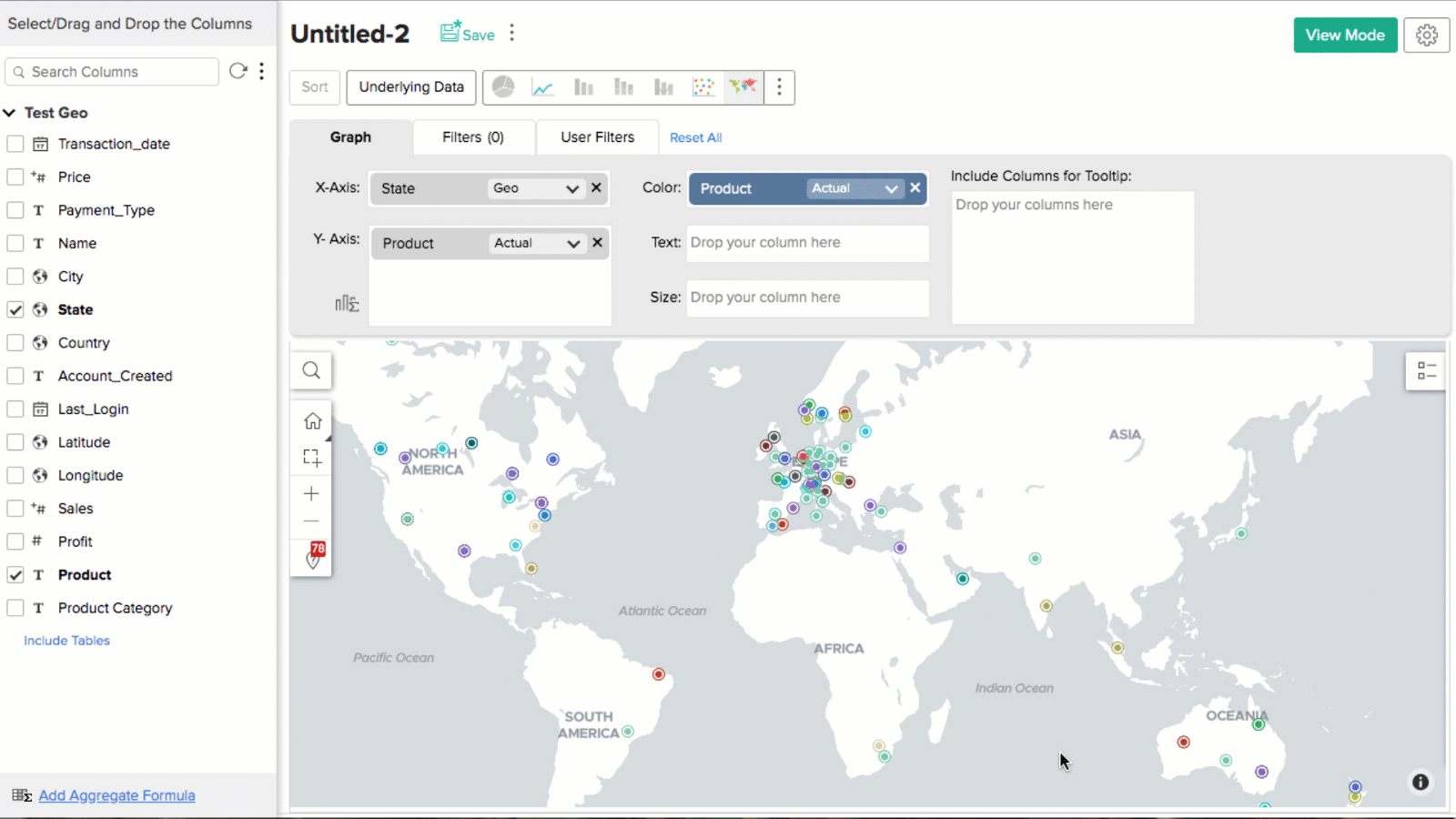 - Step 2: Drag and drop the Geo location columns in required fields, and click the Click here to Generate Graph button. You can change the chart type with the More Charts option.