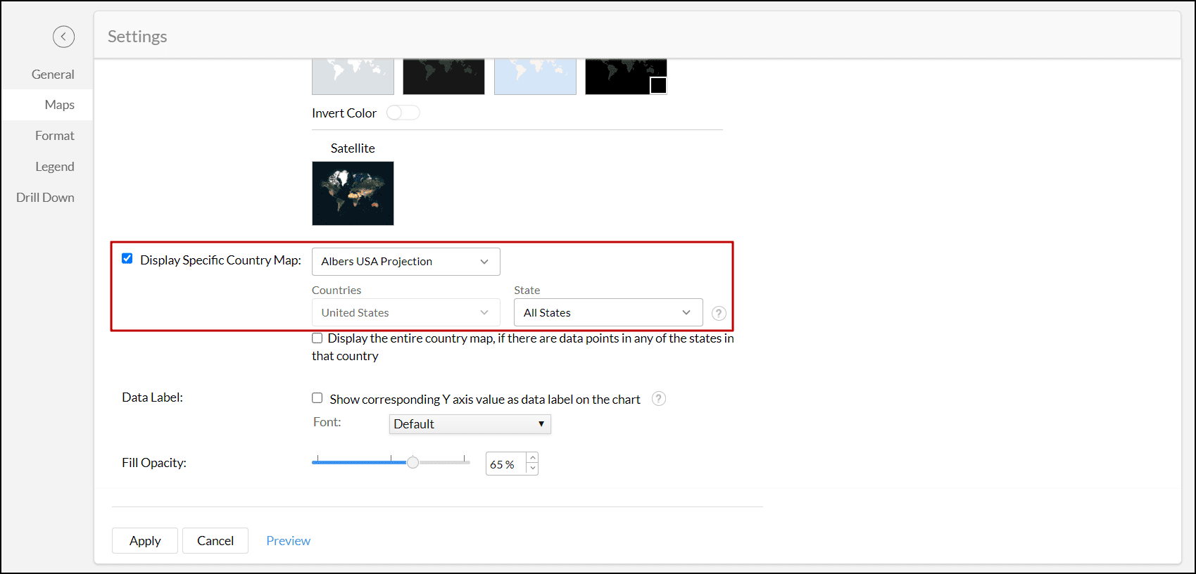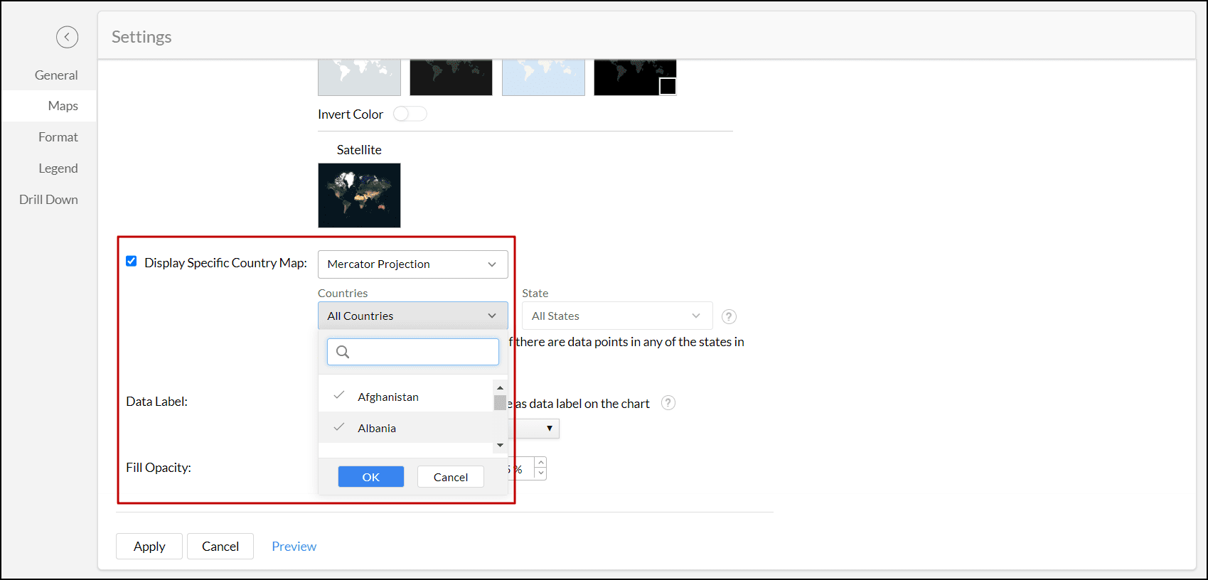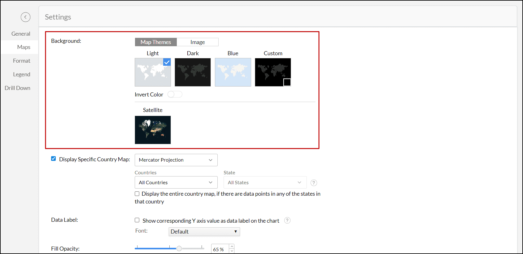 - Fill Opacity: You can specify the opacity of the chart series color. This option does not apply to Map-Scatter charts.