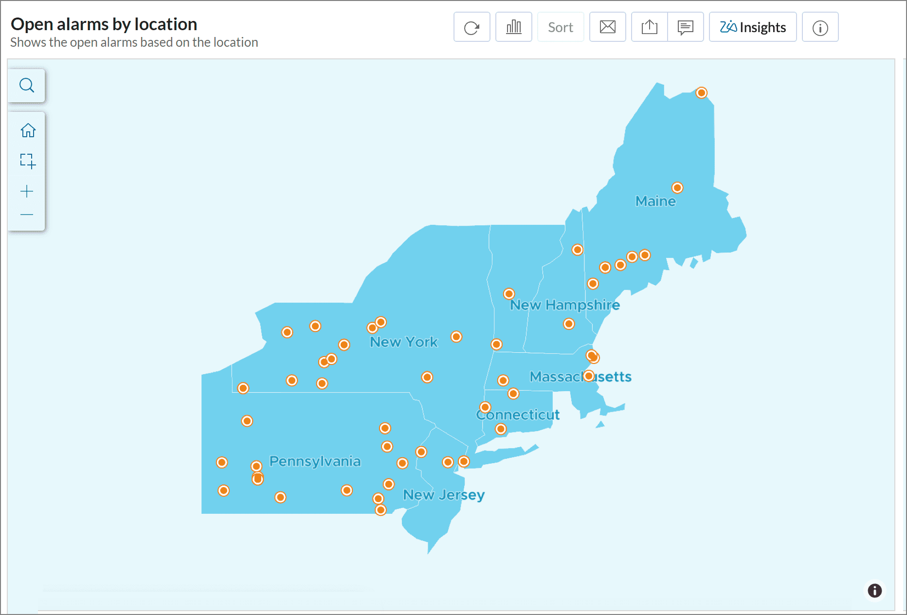 The following is an example map for analyzing the Open alarms based on Location in the north eastern parts of the United States of America.