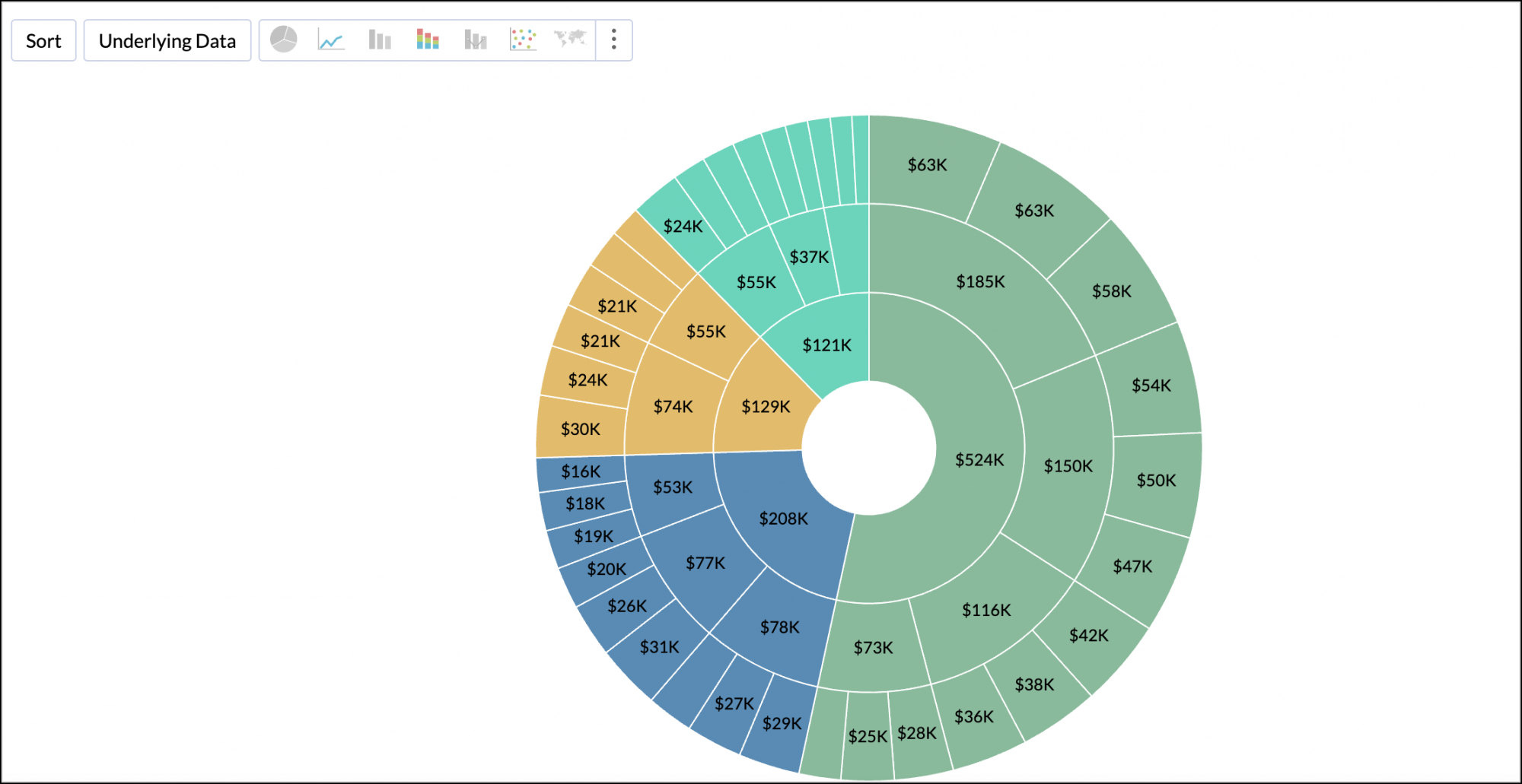 A minimum of two dimensions and one measure column are required to create a sunburst, and a maximum of six levels can be created.