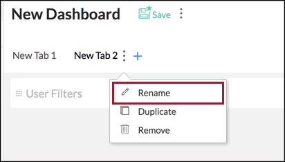 - While creating a new dashboard, click the Add Tab button. The existing views will be listed under a tab named New Tab 1, and a new tab will be created.