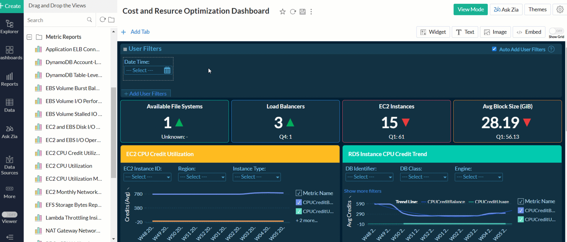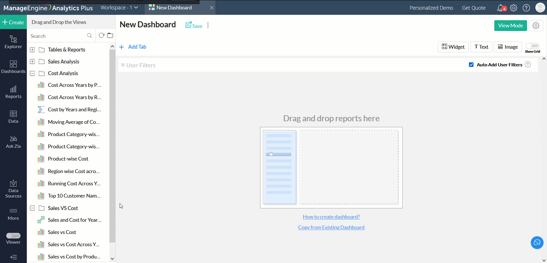 ManageEngine Analytics Plus allows you to create dashboards with multiple tabs and flexible m x n layouts. You can drag-and-drop reports and other components to your dashboard and organize them based on your requirements.
